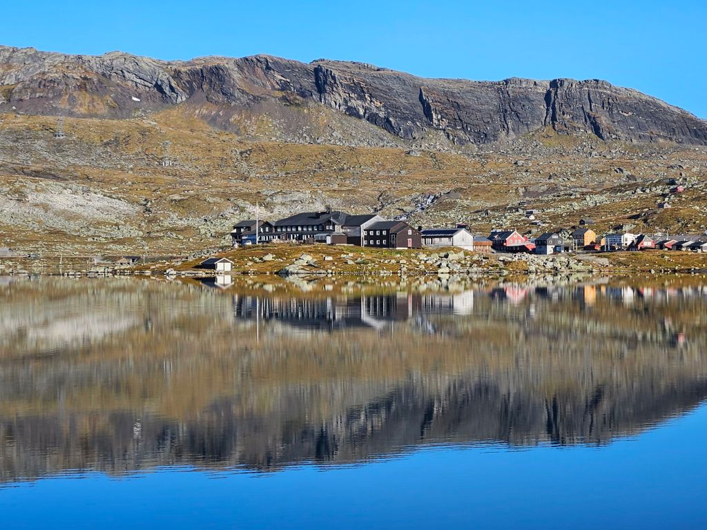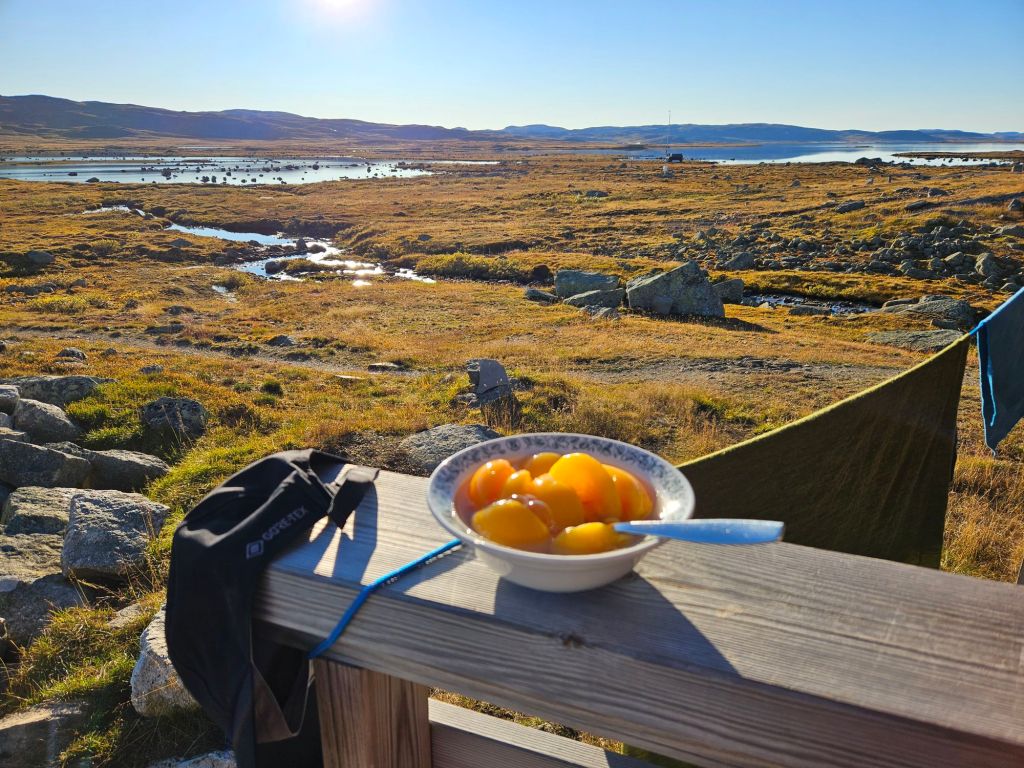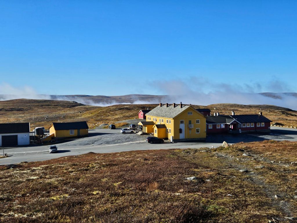 Doch da stehen Autos vor der gelben Fjellherberge. Hat die echt noch offen? Sie hat… was für eine schöne Überraschung. So kann ich meine Morgenpause gemütlich bei frischen Zimtschnecken, Cappuccinos und O-Saft geniessen. Die Besitzerin sagt, dass es der letzte Saisontag sei und ich als NPLer nichts bezahlen müsse und drückt mir noch eine Zimtschnecke für den Weiterweg in die Hand, grossartig!