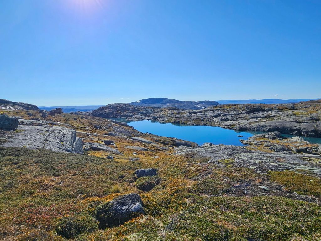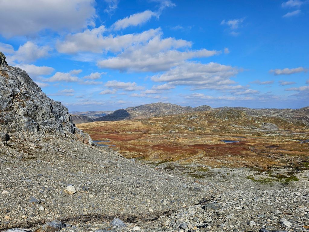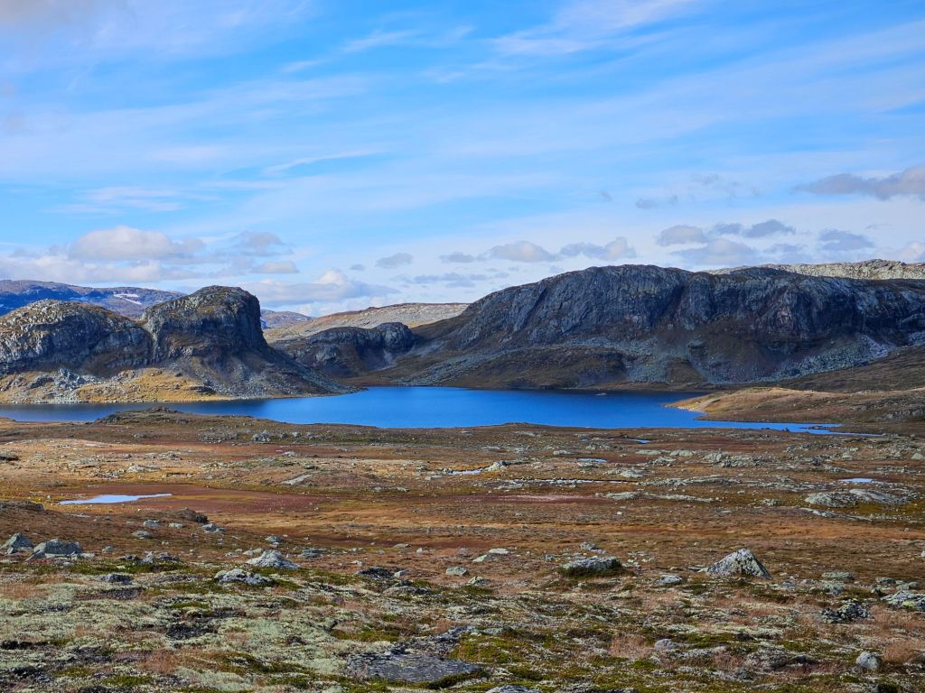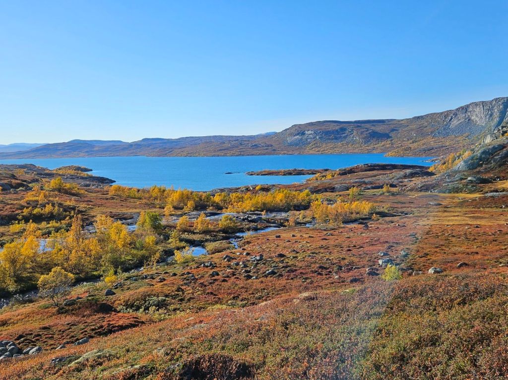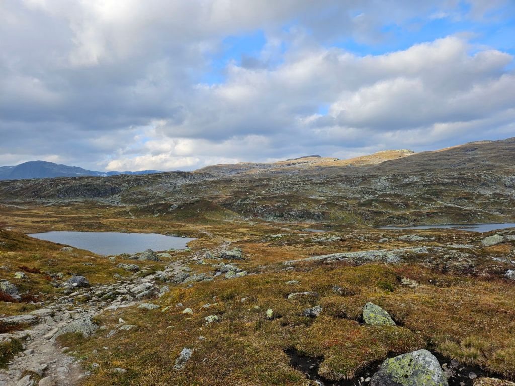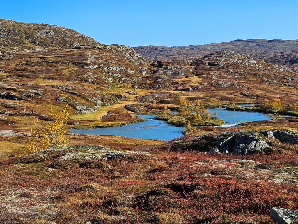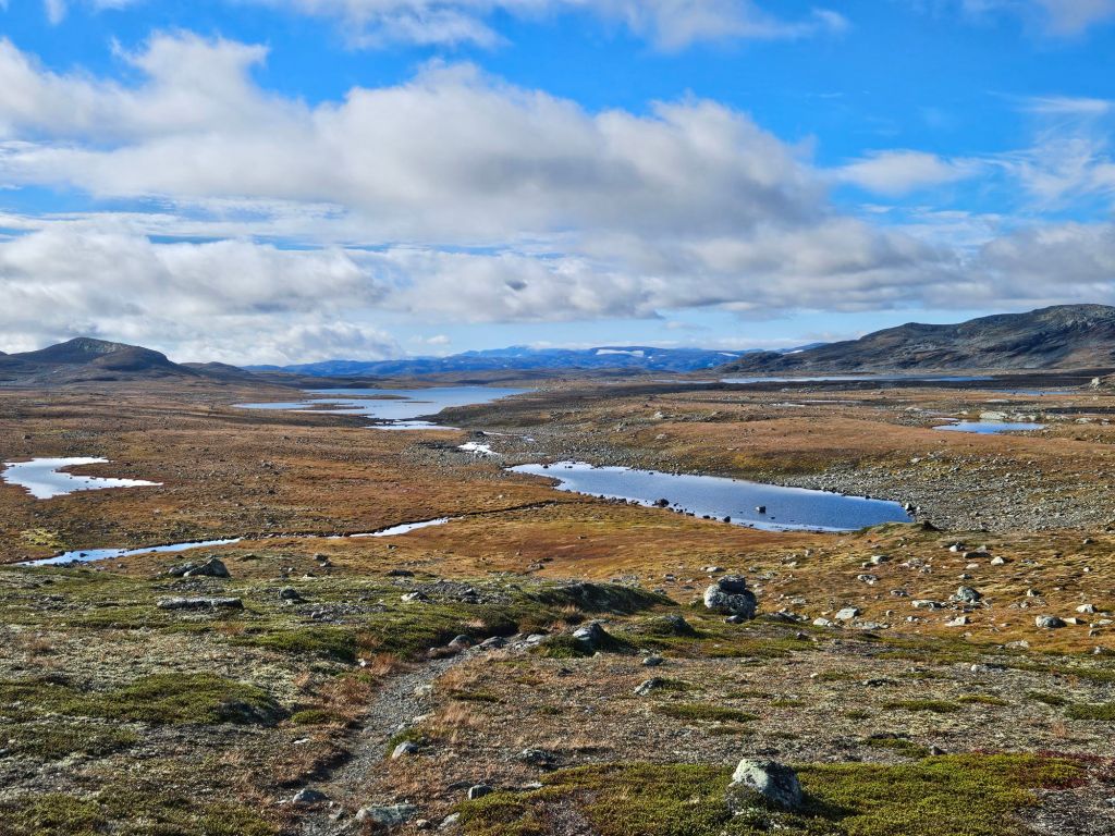 Durch viele kleine Täler und Hügel schlängelt sich der Weg südwärts. Plötzlich öffnet sich die Landschaft in ihrer ganzen Grösse und das Grjotfjell präsentiert sich in wunderschönsten Herbstfarben in allen Braun- und Ockertönen. Mitten drin die vielen Seen in ihren Stahl- und Azurblautönen.