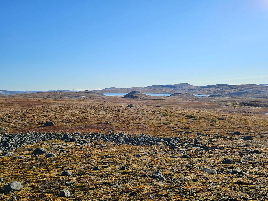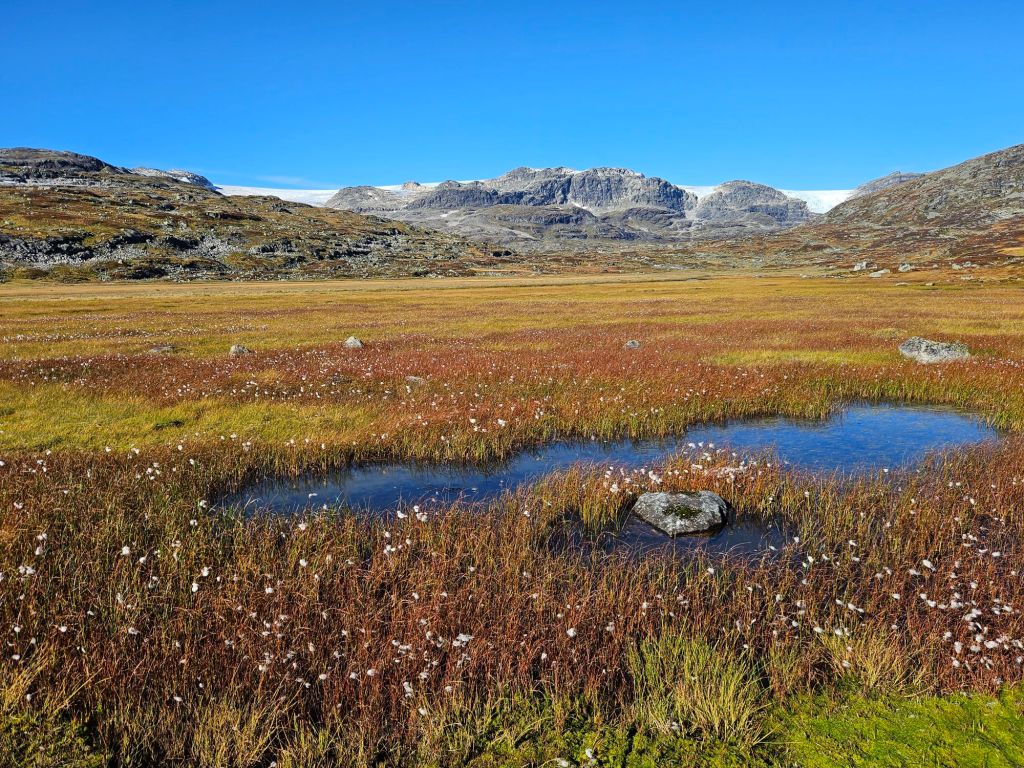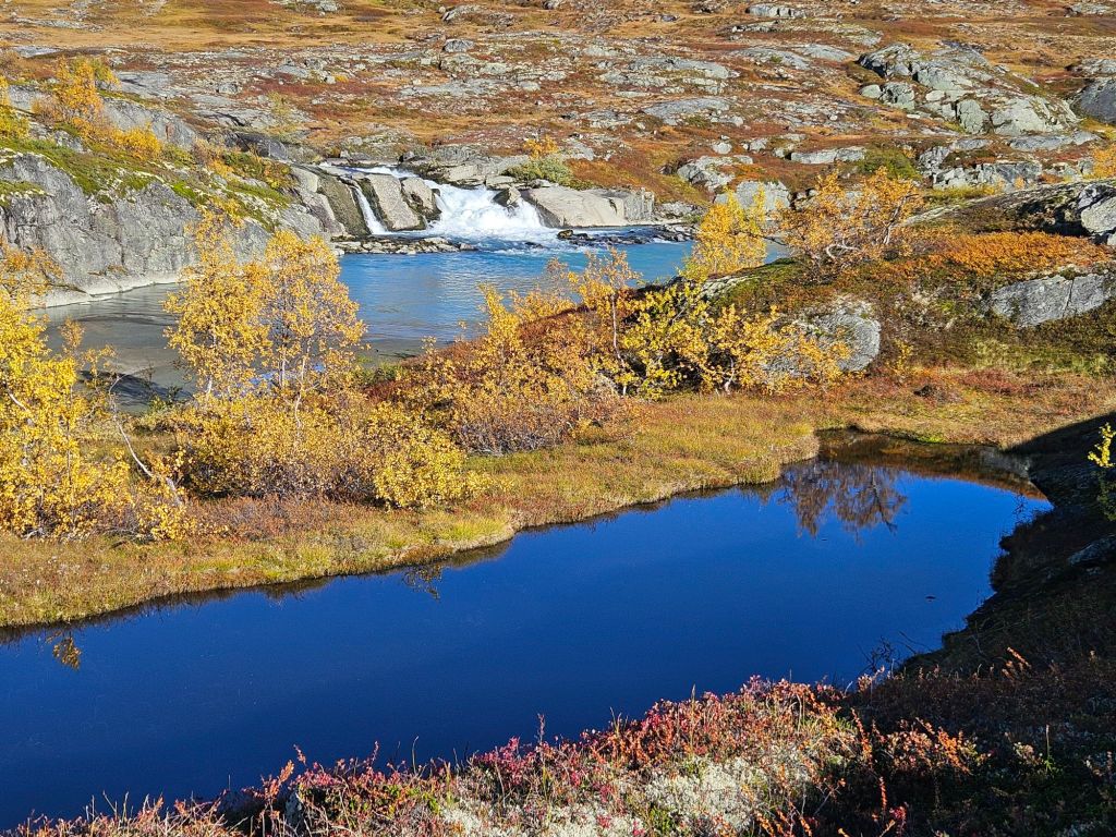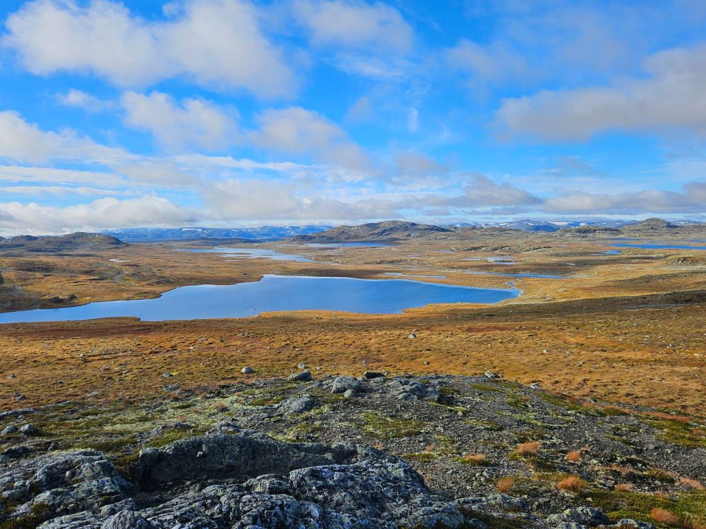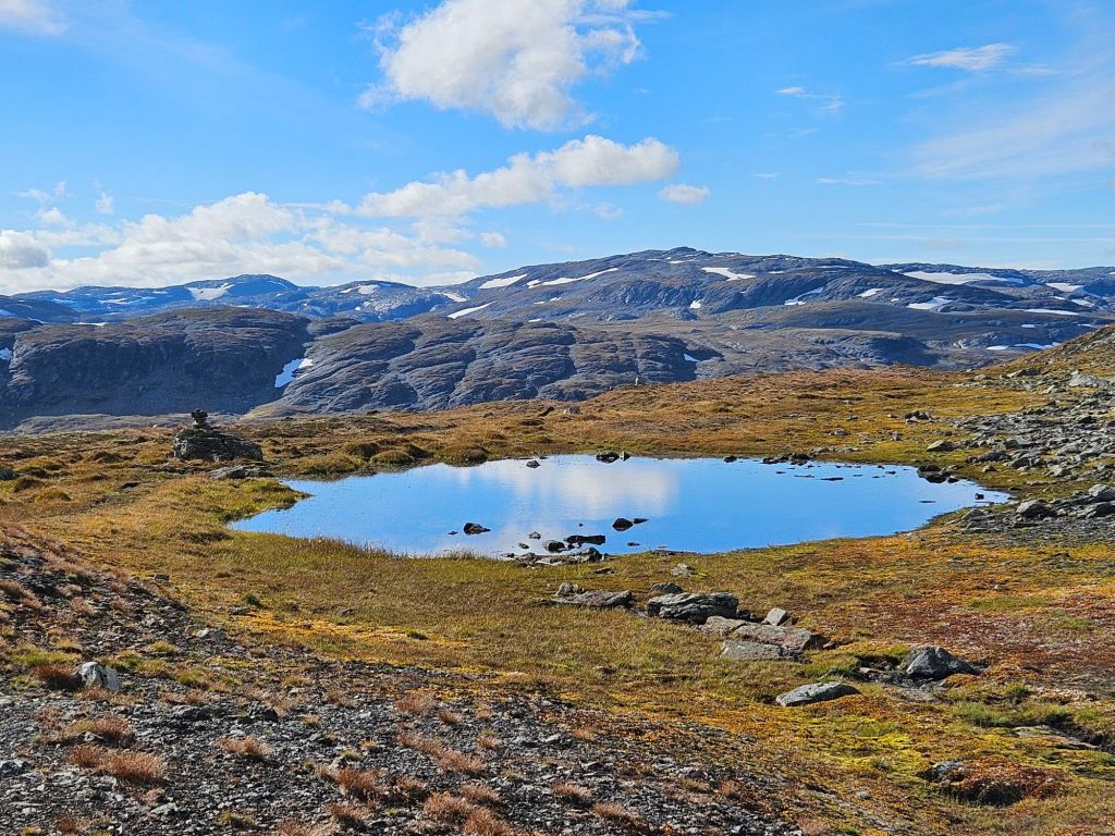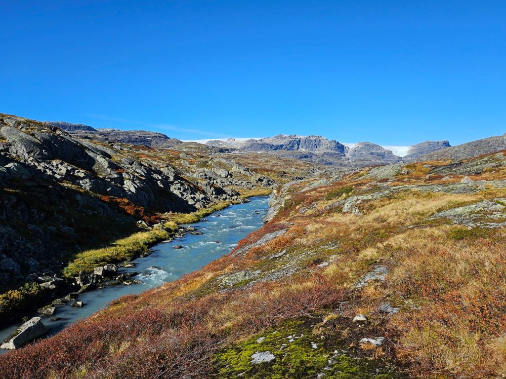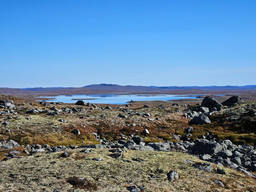 Durch viele kleine Täler und Hügel schlängelt sich der Weg südwärts. Plötzlich öffnet sich die Landschaft in ihrer ganzen Grösse und das Grjotfjell präsentiert sich in wunderschönsten Herbstfarben in allen Braun- und Ockertönen. Mitten drin die vielen Seen in ihren Stahl- und Azurblautönen.