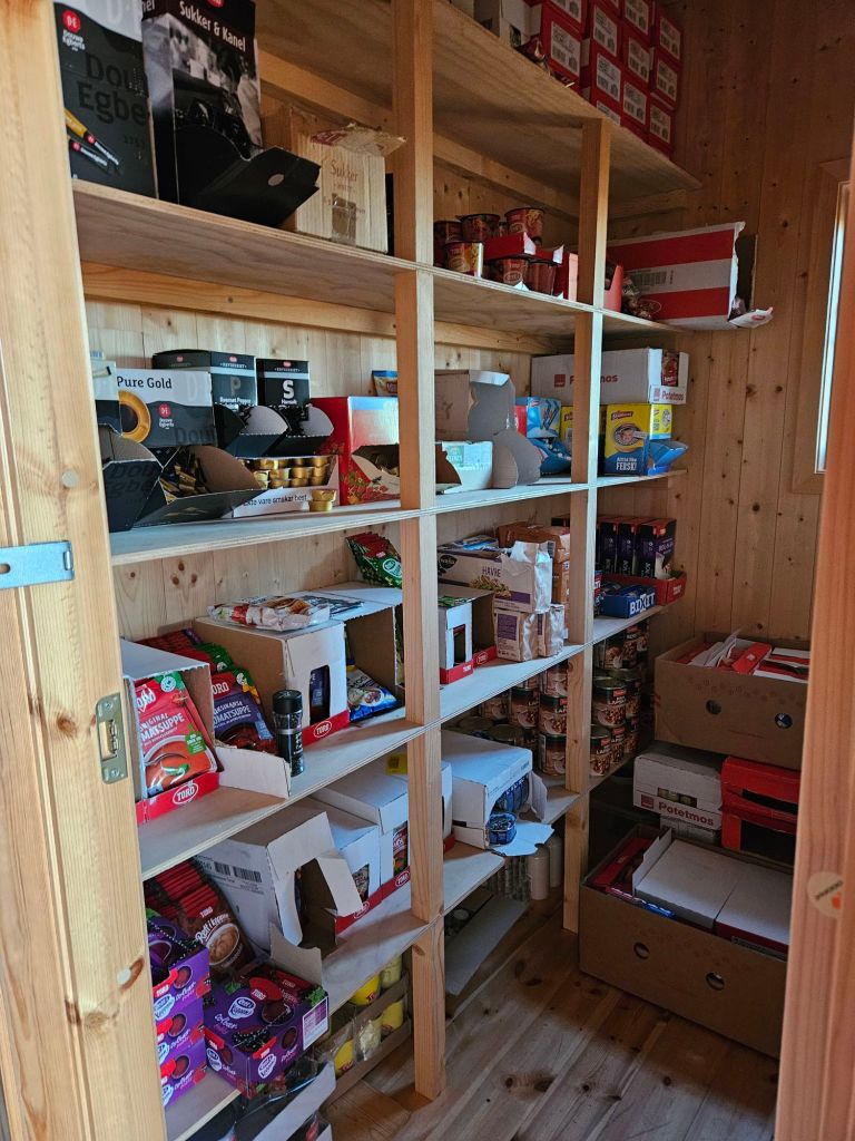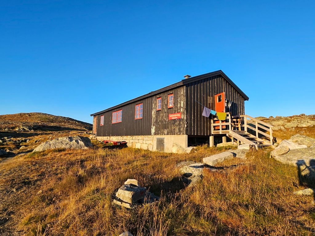 Nach knapp 35 Kilometern erreiche ich die grosse DNT Herberge Sandhaug. Die bediente Herberge hat aber seit einer Woche schon Saisonschluss und das Haupthaus ist geschlossen. Nebenan steht die Selbstbedienungshütte, die alles hat was man braucht, inkl. einem gut gefüllten Proviantraum.