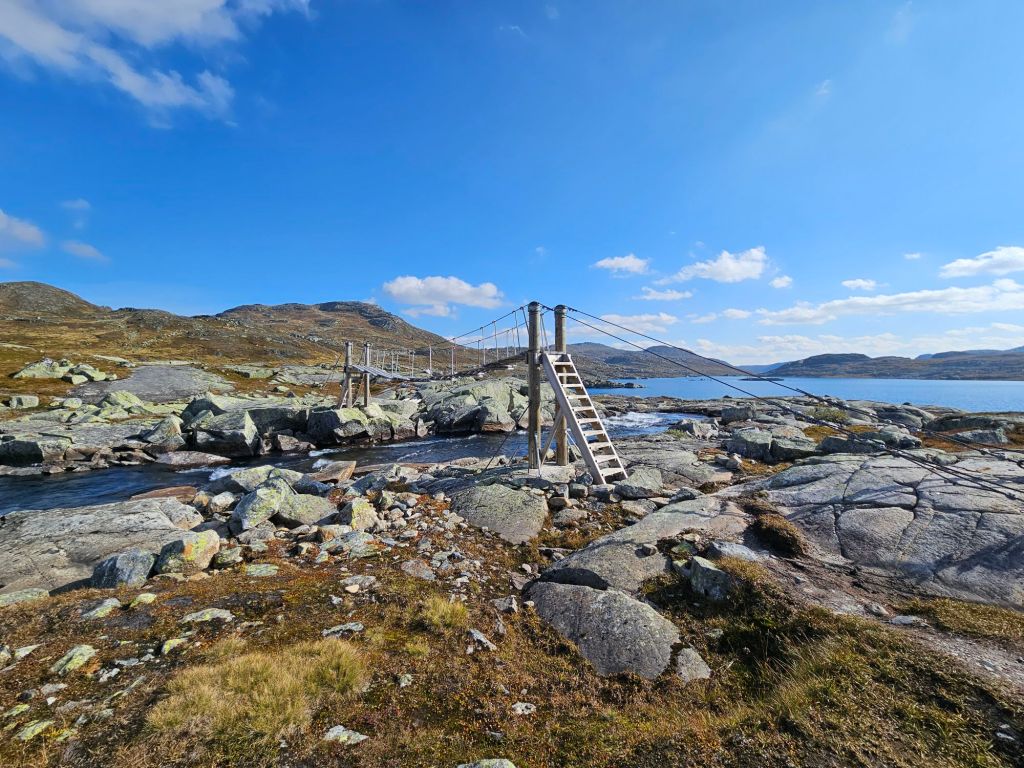 Ich schaue auf meine Karte und zähle 10 Brücken bis Haukeliseter. Ein paar wie diese vis a vis von Sandhaug werden wohl Ganzjahresbrücken sein, aber es wird sicher auch Sommerbrücken haben.