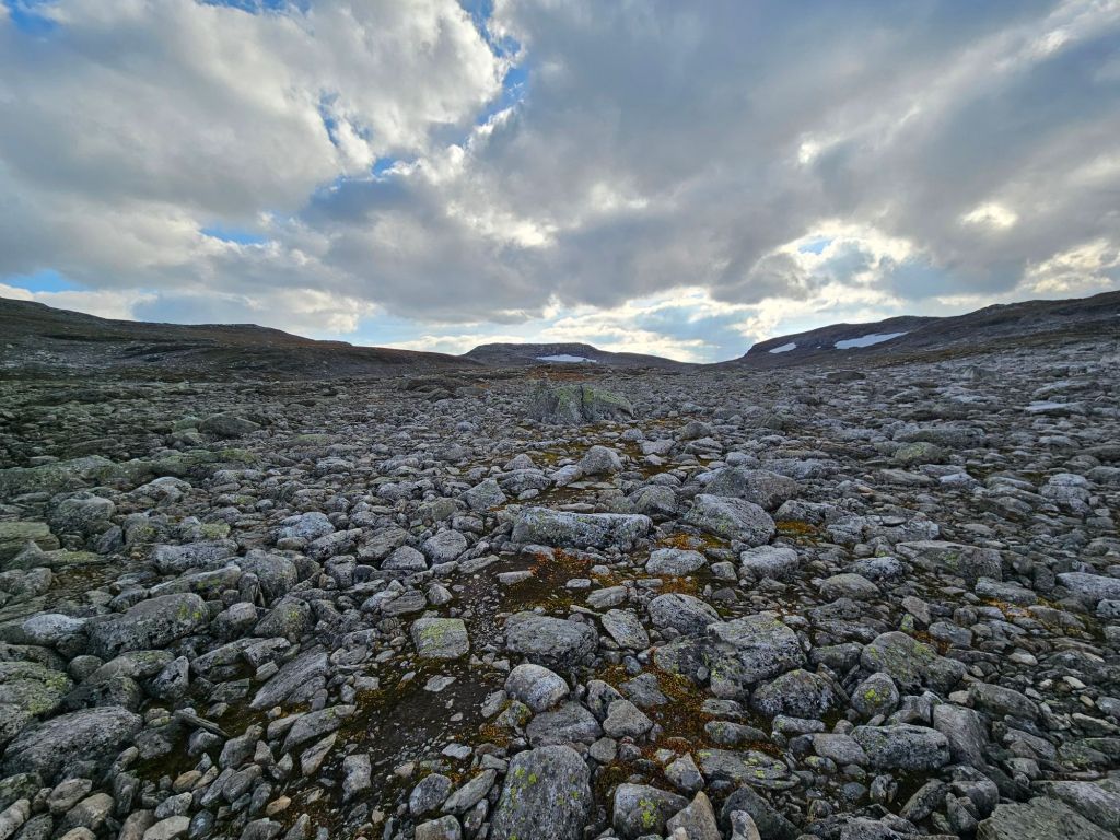 Kaum befinde ich mich auf der Südseite des Plateaus, beginnt sich das Gelände abzuflachen. Ein älterer englischer Gentleman, der seit 20 Jahren in Norwegen lebt, meint „ab hier hast du es geschafft, das Gelände wird gemütlicher bis Haukeliseter“. Ich schenke ihm meinen Glauben, ist er doch die Strecke Finse-Haukeliseter schon rund 30x gelaufen!