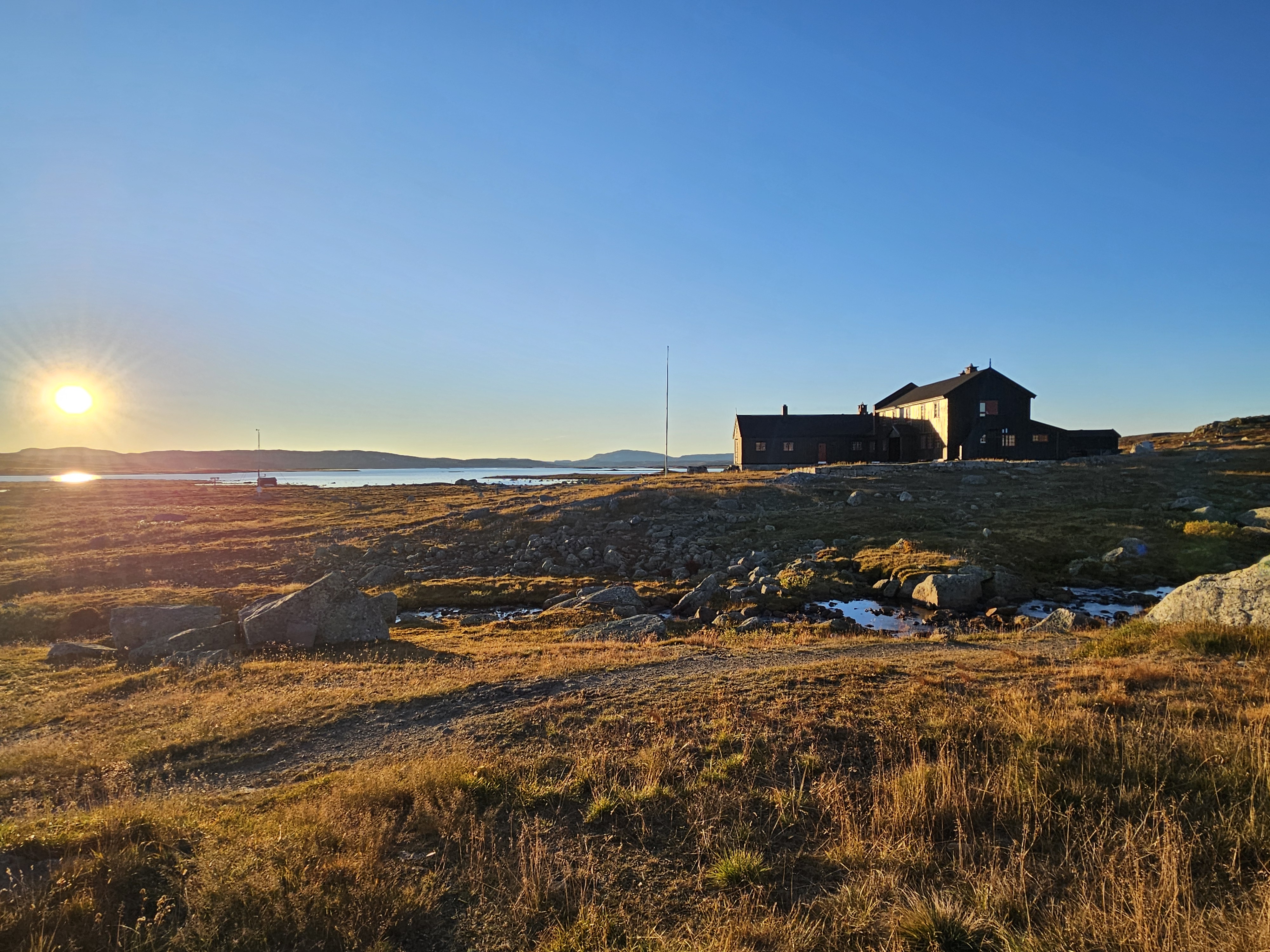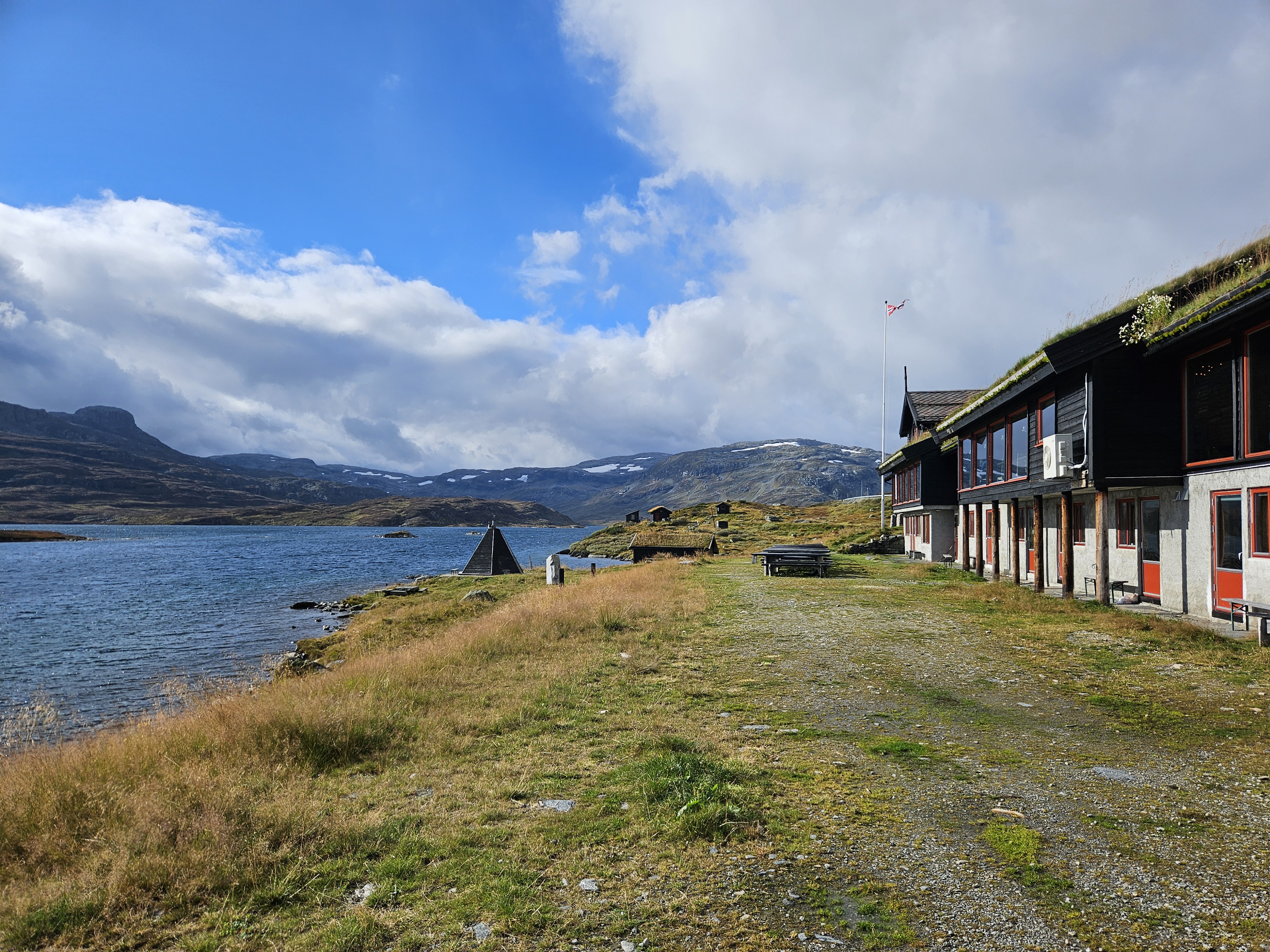 Nach knapp 35 Kilometern erreiche ich die grosse DNT Herberge Sandhaug. Die bediente Herberge hat aber seit einer Woche schon Saisonschluss und das Haupthaus ist geschlossen. Nebenan steht die Selbstbedienungshütte, die alles hat was man braucht, inkl. einem gut gefüllten Proviantraum.