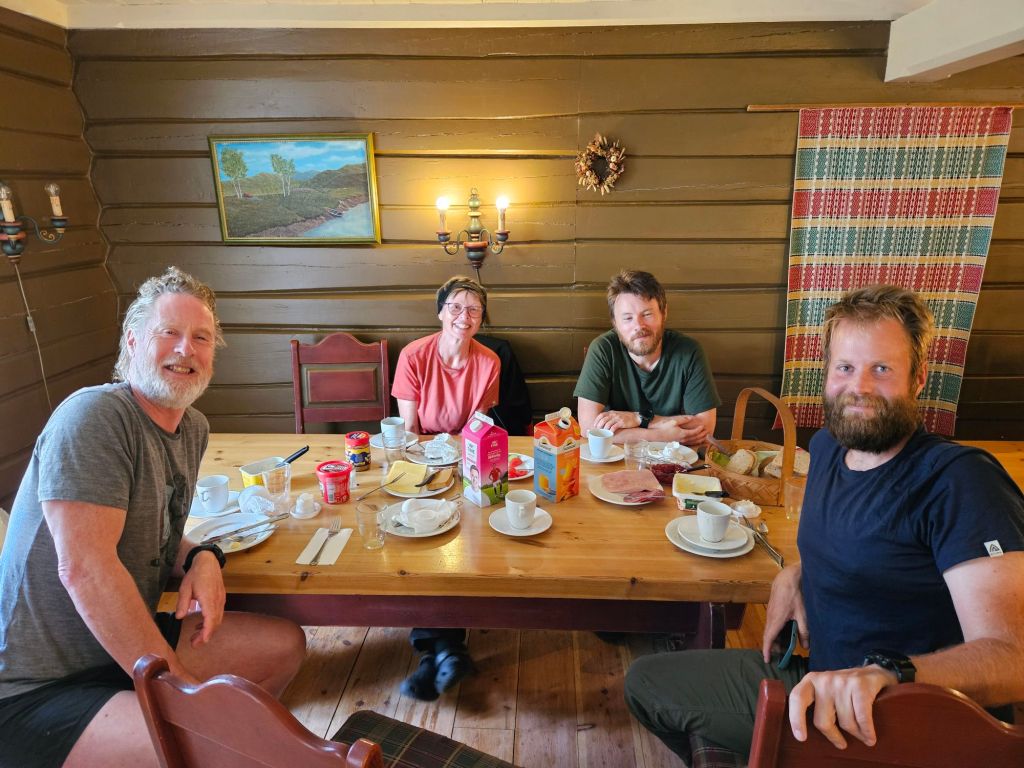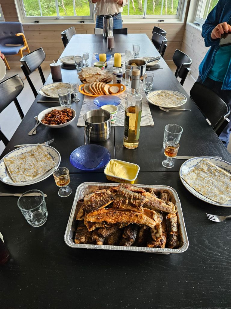 Die DNT Leute haben Unmengen an Lebensmittel für eine Woche mit dem Boot hergeführt und beenden noch letzte Arbeiten an der Hütte. Es vergehen kaum 10 Minuten, da stehe ich schon mit einer Dose Bier in der Hand mitten in der Hütte. Fröhliches Geplauder und Gelächter und es wird sofort klar, das ist eine gemütliche Truppe hier. Die Nachtesseneinladung folgt umgehends und so sitze ich schon bald an einem wunderbar duftenden, vollen Tisch. Fisch, Kartoffeln, Pilze, Fladenbrot, gesalzene Butter, Sauerrahm und, und, und….nicht zu vergessen die drei Flaschen Aquavit Schnapps.
