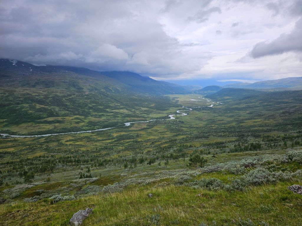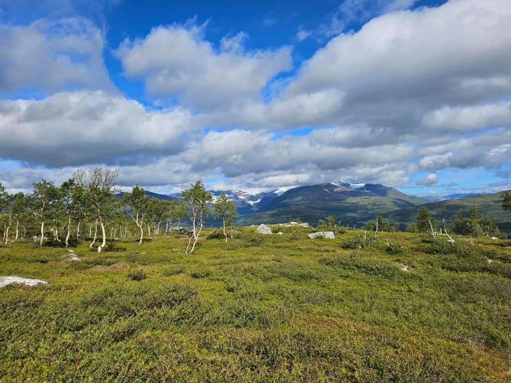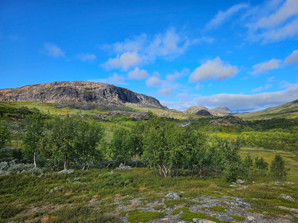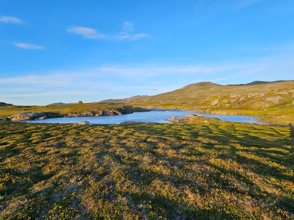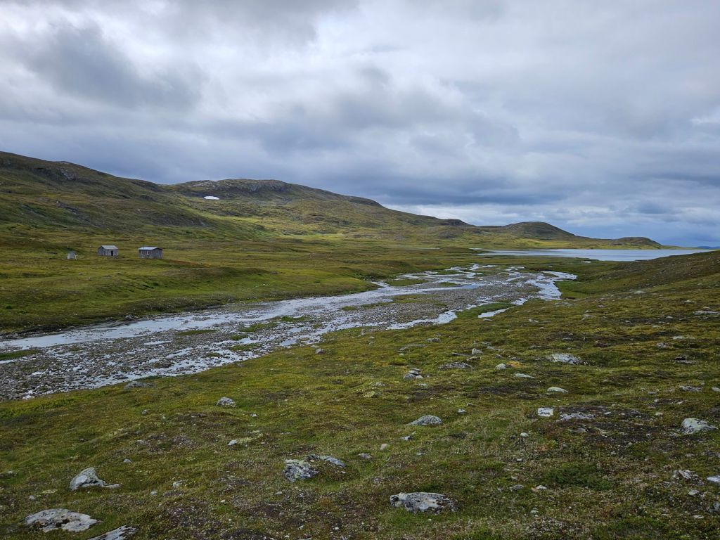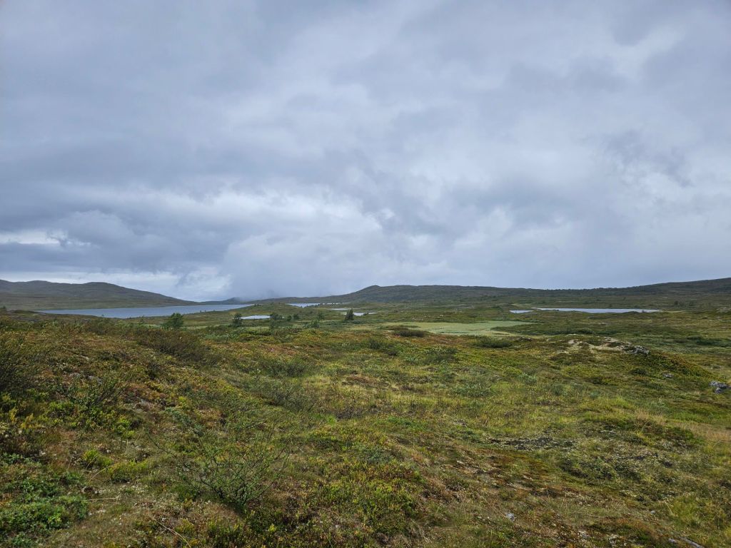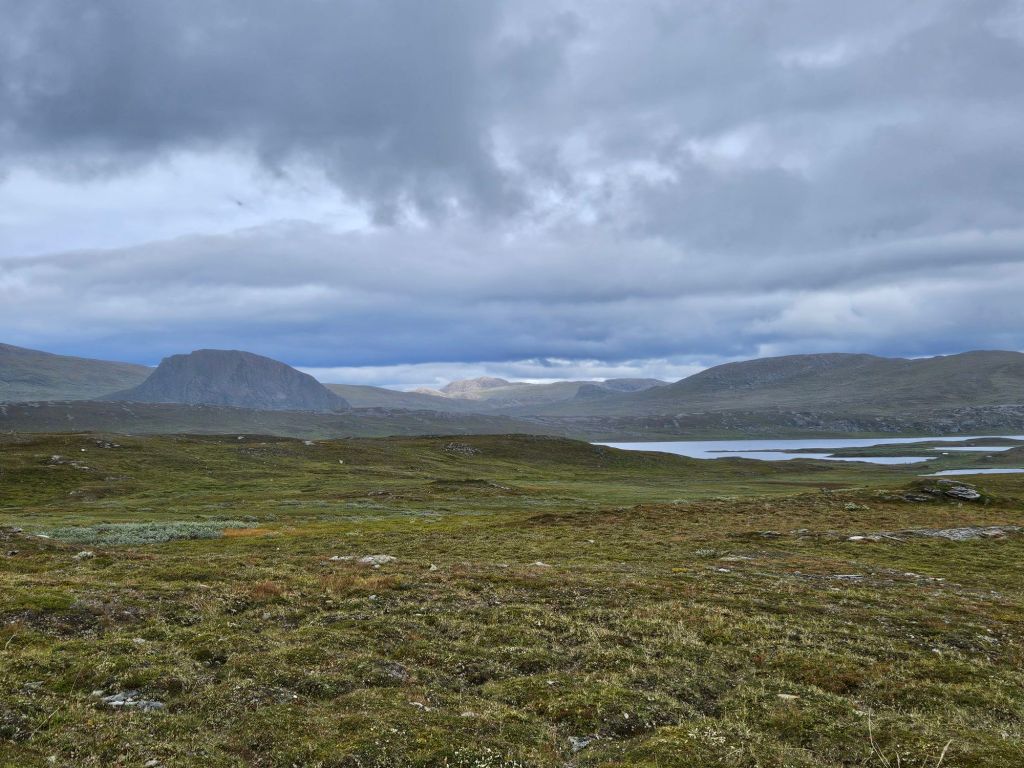 Am Himmel machen sich langsam Vorboten des Regens breit und so mache ich mich auf Richtung Tverelvnes gård. Die Landschaft ist unheimlich schön und es ist mal wieder ein Vollgenuss oberhalb der Wald- und Sumpfgrenze zu wandern. Nichts gegen Wald und Botanik, aber die Hochfjells sind halt definitiv entspannter zu durchlaufen.