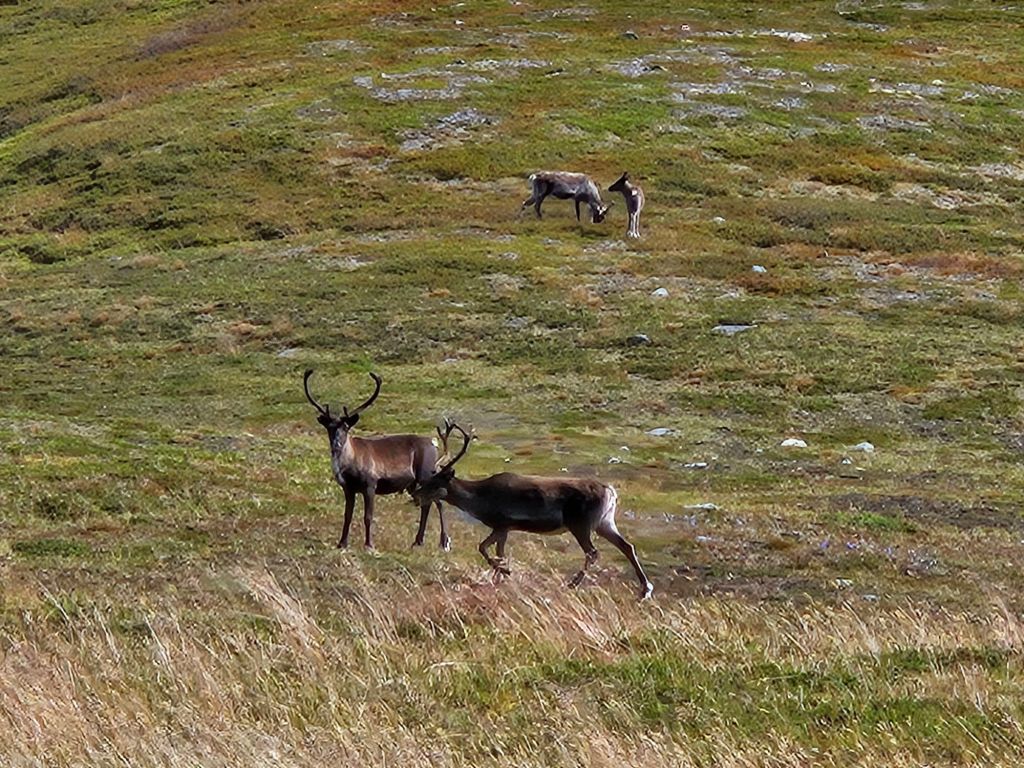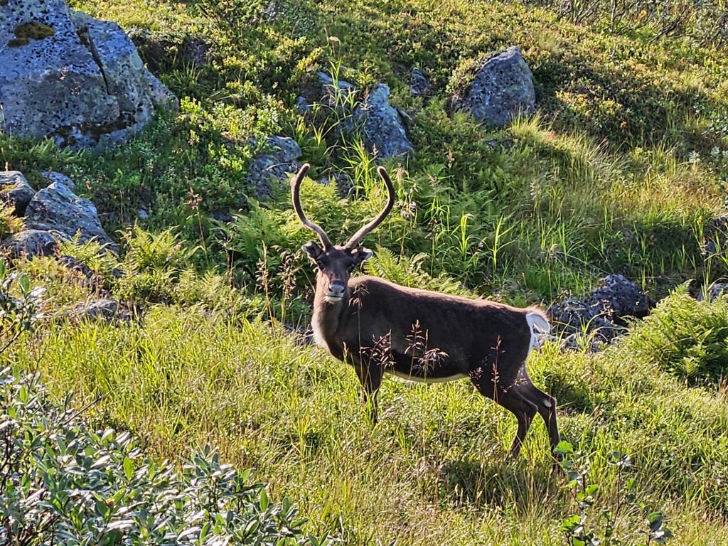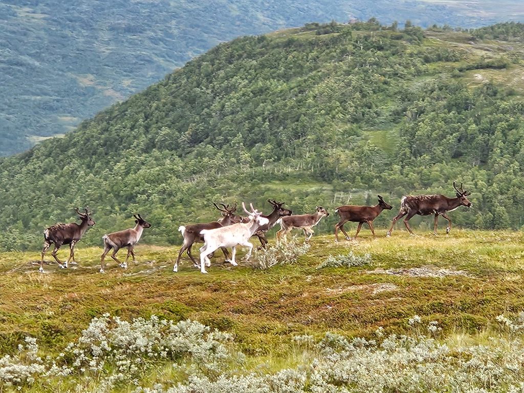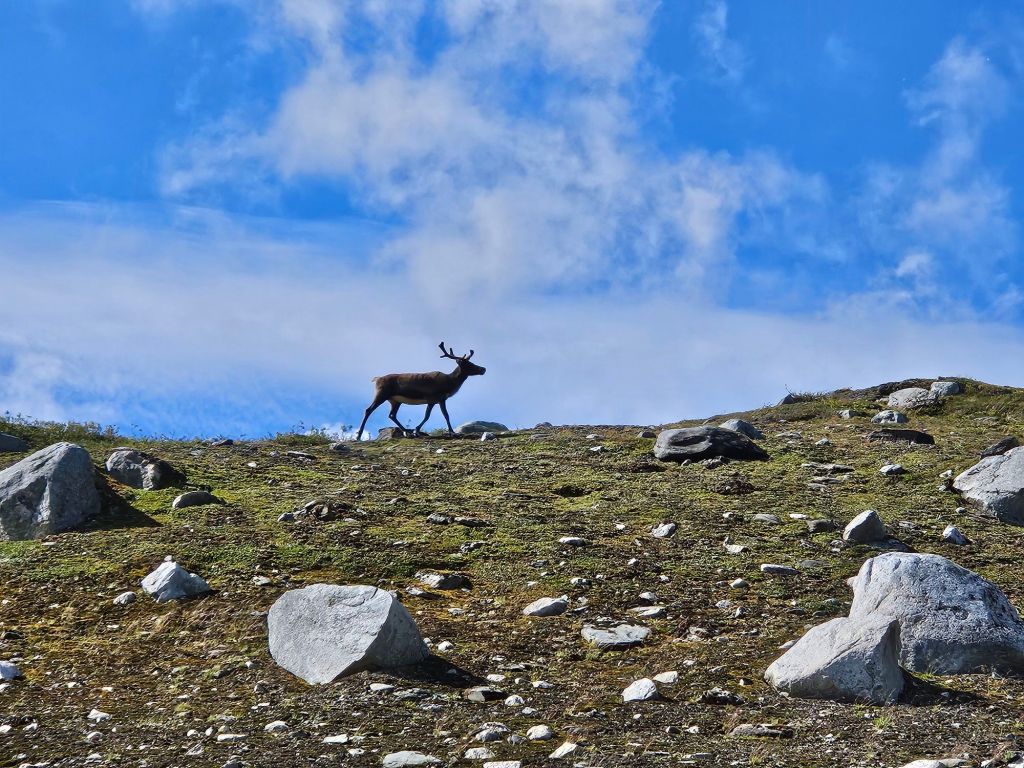 Gerade als ich meinen Rucksack schultern will, höre ich das typische „Krikrikri“ von den Fjelljos. Die Artverwandten der Tyvjos, (sie sehen sich sehr ähnlich), kreisen um mich herum. Doch dieses Mal greifen sie nicht mich an, sondern Mama und Papa haben Flugschule mit dem Junior. Noch ganz braun, ohne das typische weisse Gefieder mit der schwarzen Zorro-Maske, hat er aber mittlerweile die Grösse der Eltern. Wahnsinn…noch im Dividalen waren das kleine, süsse, graue Wollknäuel, die kaum laufen konnten und jetzt sind sie schon Akrobaten der Lüfte. Auch die Rentier Kälber haben mittlerweile an Grösse zugelegt. Die Zeit vergeht im Fluge und mit den ersten gelben Blättern der Birken scheint der Herbst anzuklopfen.
