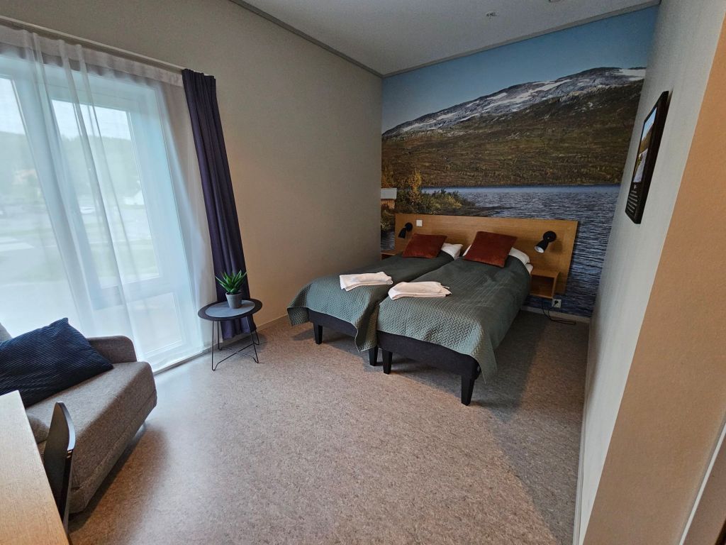 Gerade neben der Piste liegt mein Hotel, das Fjell Folkets Hus. Ein sehr neues und interessantes Projekt. Das Hotel ist unbesetzt und kann nur Online gebucht werden. Code für das Zimmer kommt per Mail. Die Zimmer sind inmitten von Büros und doch privat. Das grosse Frühstücksangebot liegt im Kaffeeraum der Büroangestellten und ermöglicht so auch Kontakt zu den Einheimischen. Im Haus hat es ein Museum, ein Café, ein Souvenirshop, die Tourist Information, Geldautomat und was ich leider zu spät gesehen habe, eine Waschmaschine. Ungewohnt, aber mehr als praktisch und vollauf genügend für einen Nightstop.