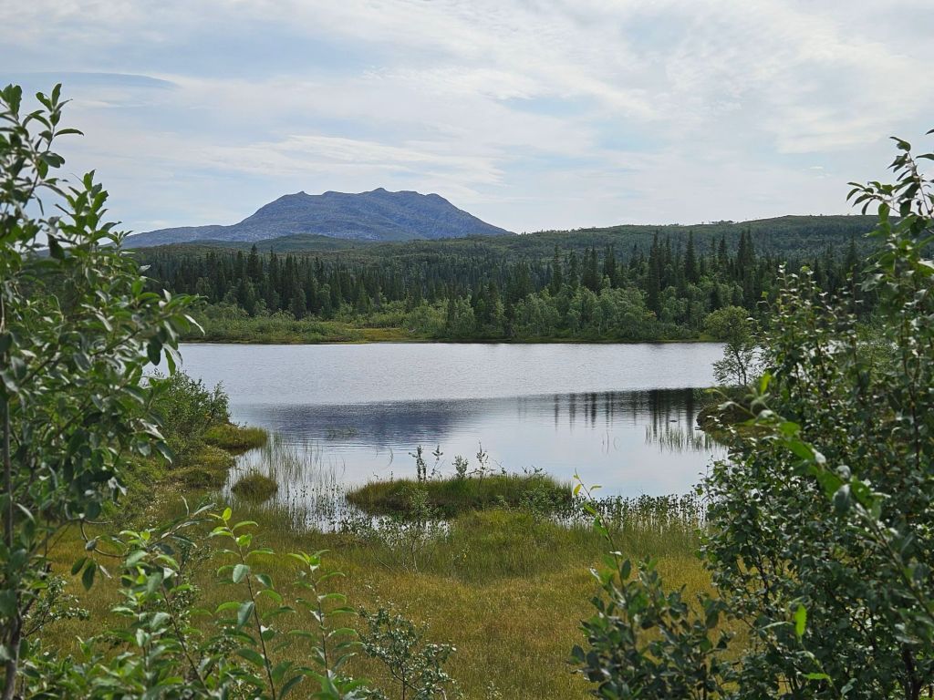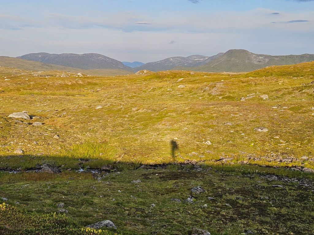 Mittlerweile hat die fast ununterbrochene Schönwetterphase bei mir auch einen Knacks bekommen. Das Tief über Britanien sendet jetzt unentwegt Feuchtigkeit rüber für die nächsten Tage. Die Prognose für eines der schönsten Täler Norwegens, das Spjeltfjelldalen, sagt nur am Morgen etwas gutes Wetter voraus. So mache ich mich relativ früh auf, um zumindest den grössten Sumpf noch ohne Dusche absolvieren zu können.