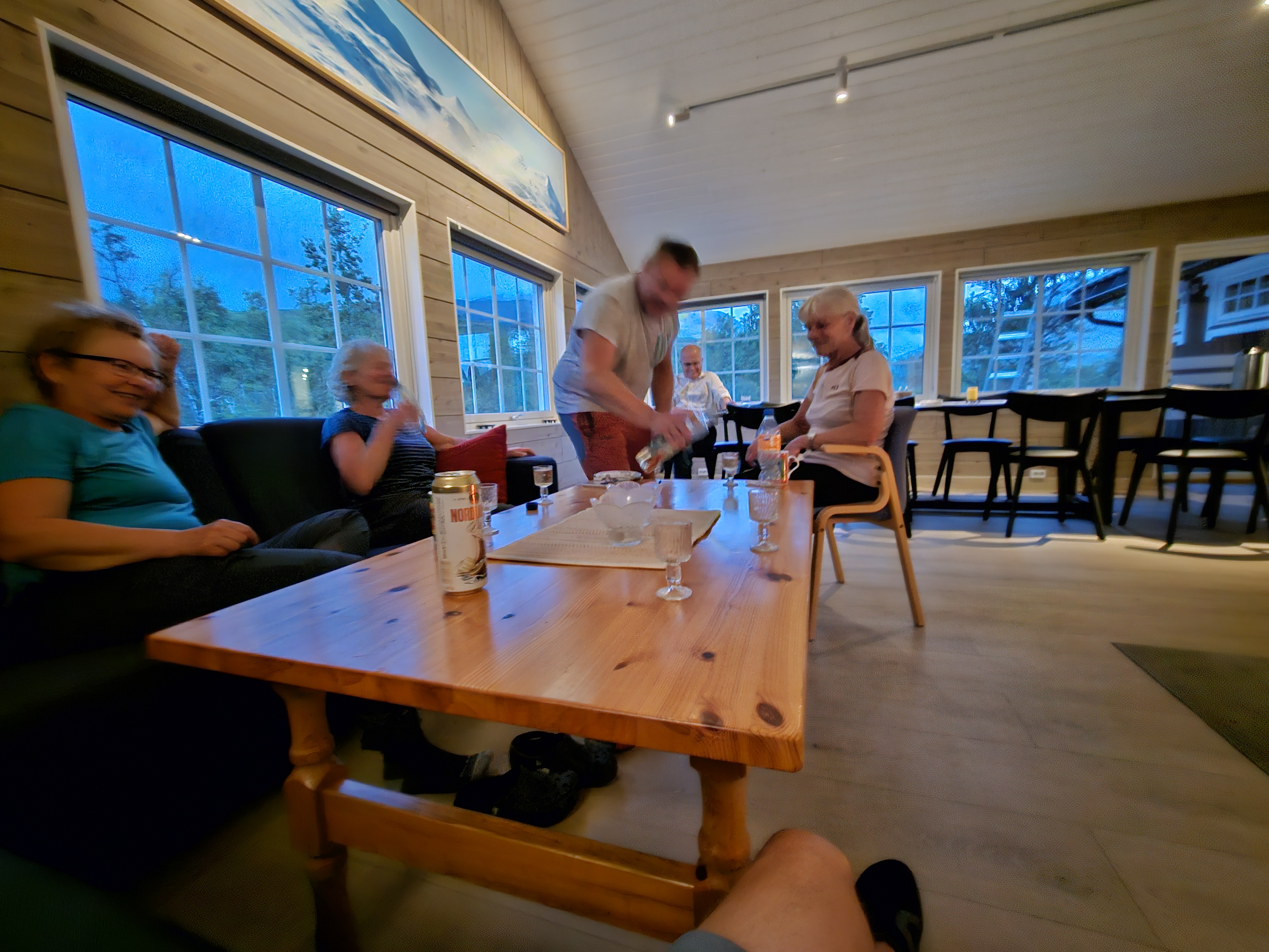 Die DNT Leute haben Unmengen an Lebensmittel für eine Woche mit dem Boot hergeführt und beenden noch letzte Arbeiten an der Hütte. Es vergehen kaum 10 Minuten, da stehe ich schon mit einer Dose Bier in der Hand mitten in der Hütte. Fröhliches Geplauder und Gelächter und es wird sofort klar, das ist eine gemütliche Truppe hier. Die Nachtesseneinladung folgt umgehends und so sitze ich schon bald an einem wunderbar duftenden, vollen Tisch. Fisch, Kartoffeln, Pilze, Fladenbrot, gesalzene Butter, Sauerrahm und, und, und….nicht zu vergessen die drei Flaschen Aquavit Schnapps.