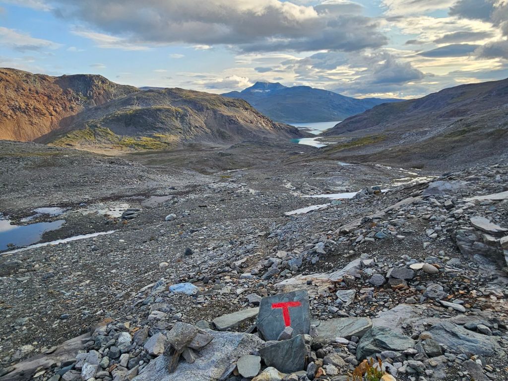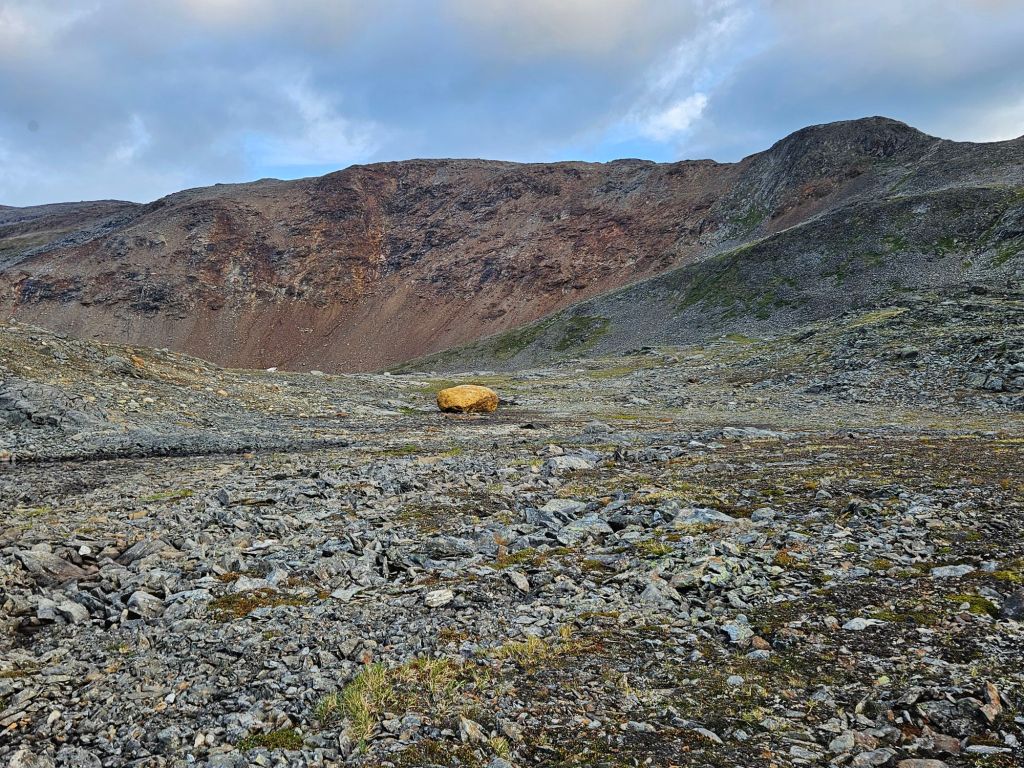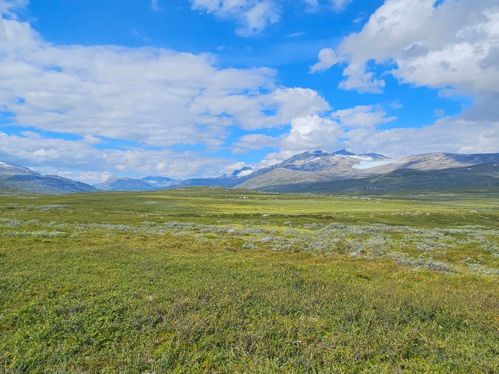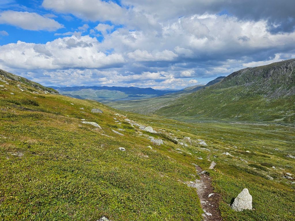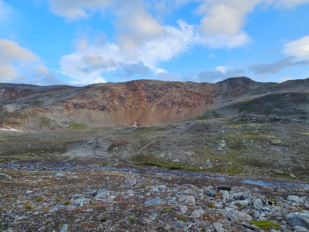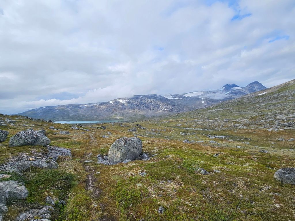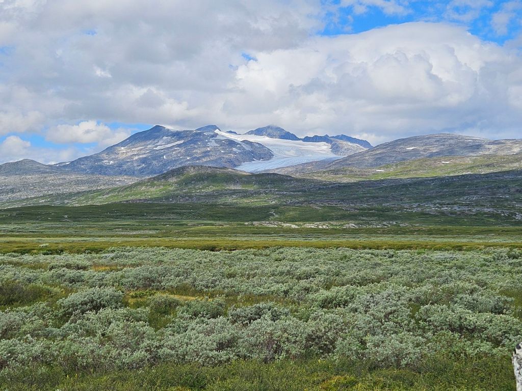 Entlang des Norddalen und mit einem wunderschönen Blick auf das Storsteinfjellet, mit seinem immer kleiner werdenden Gletscher, biege ich Richtung Cáihnavággi ab. Ab hier steigt der Weg auf 1000 MüM an.