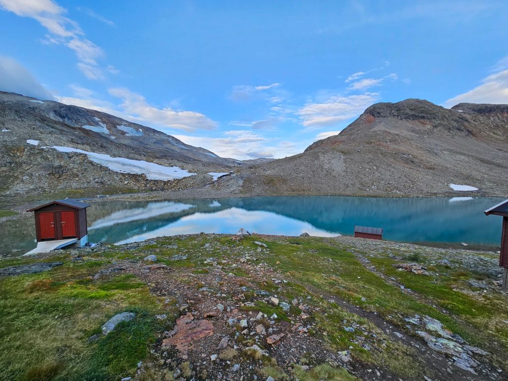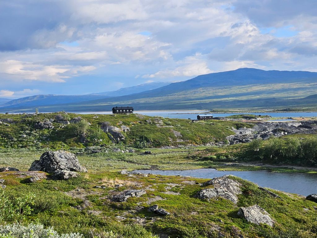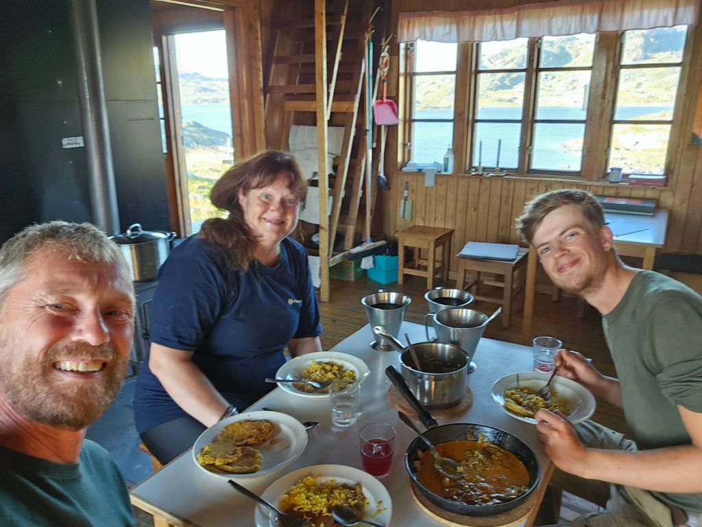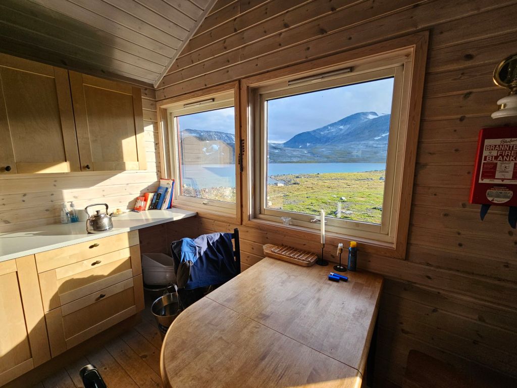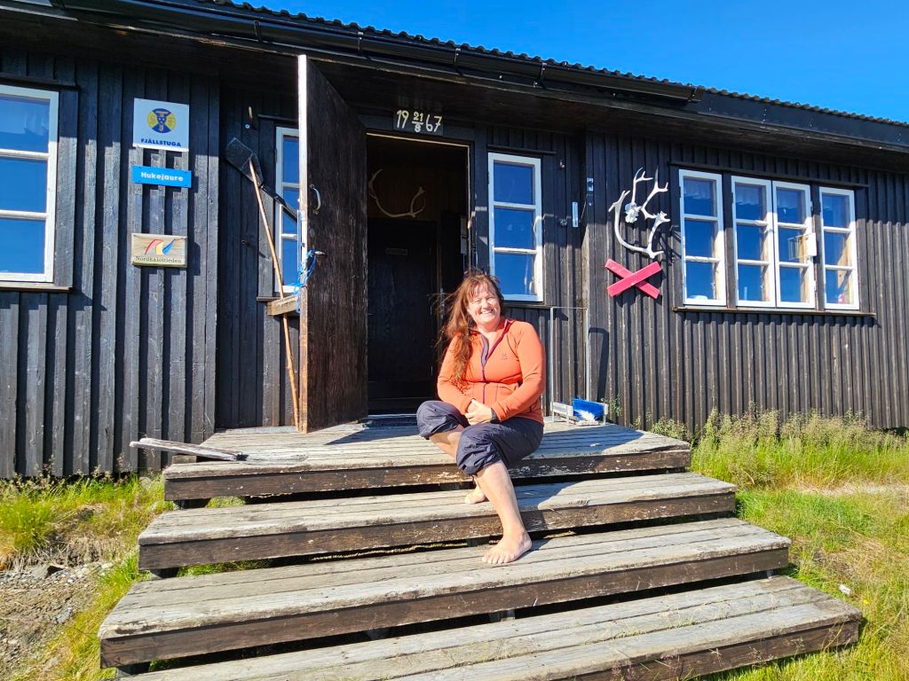 Einmal mehr „erwische“ ich einen absoluten Hammertag hier oben. Wetter das nicht schöner sein könnte und weit und breit kein Mensch. Ausser….Mia, die Hüttenwartin von Hukejaure. Wir kommen schnell ins Gespräch und sie empfängt mich herzlich in Huke und lädt mich gleich zum Nachtessen ein. Da sonst niemand da ist, könne sie auch statt nur für sich, auch gleich für mich mitkochen. Das Angebot nehme ich nur zu gerne an! Kurz darauf trifft noch Stian ein, der für einen kurzen Halt hier pausiert und gleich miteingeladen wird.