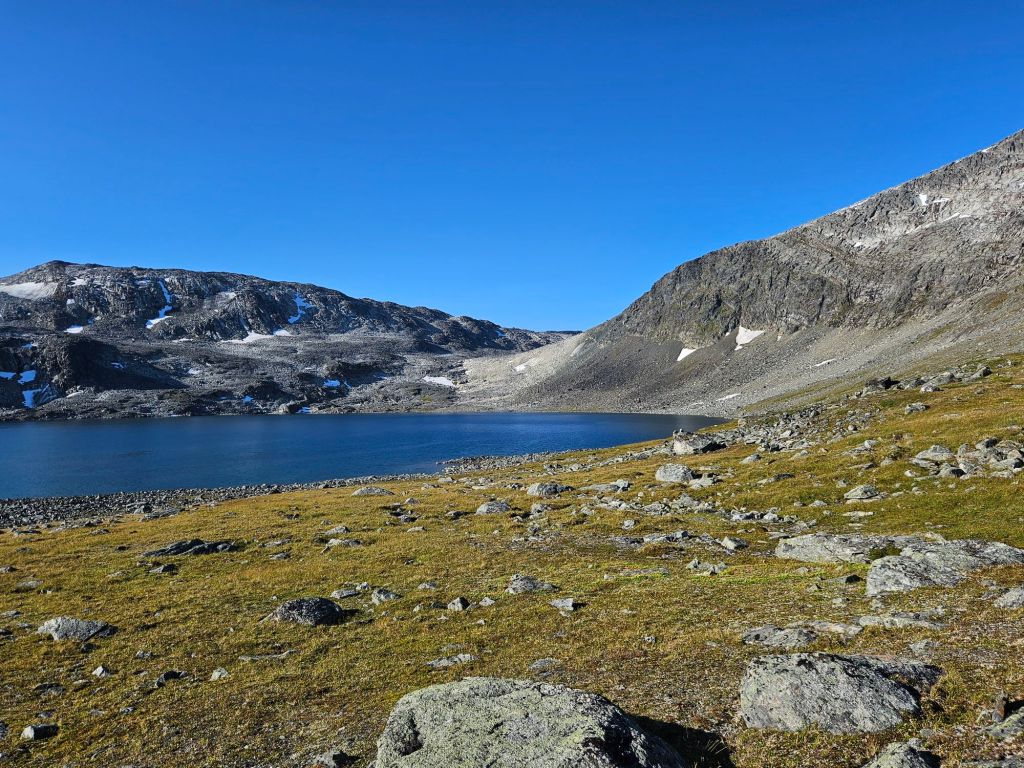 Am See Sårjåsjávrre mache ich eine kurze Mittagspause, bevor es dem ganzen See entlang zur Grenze geht.