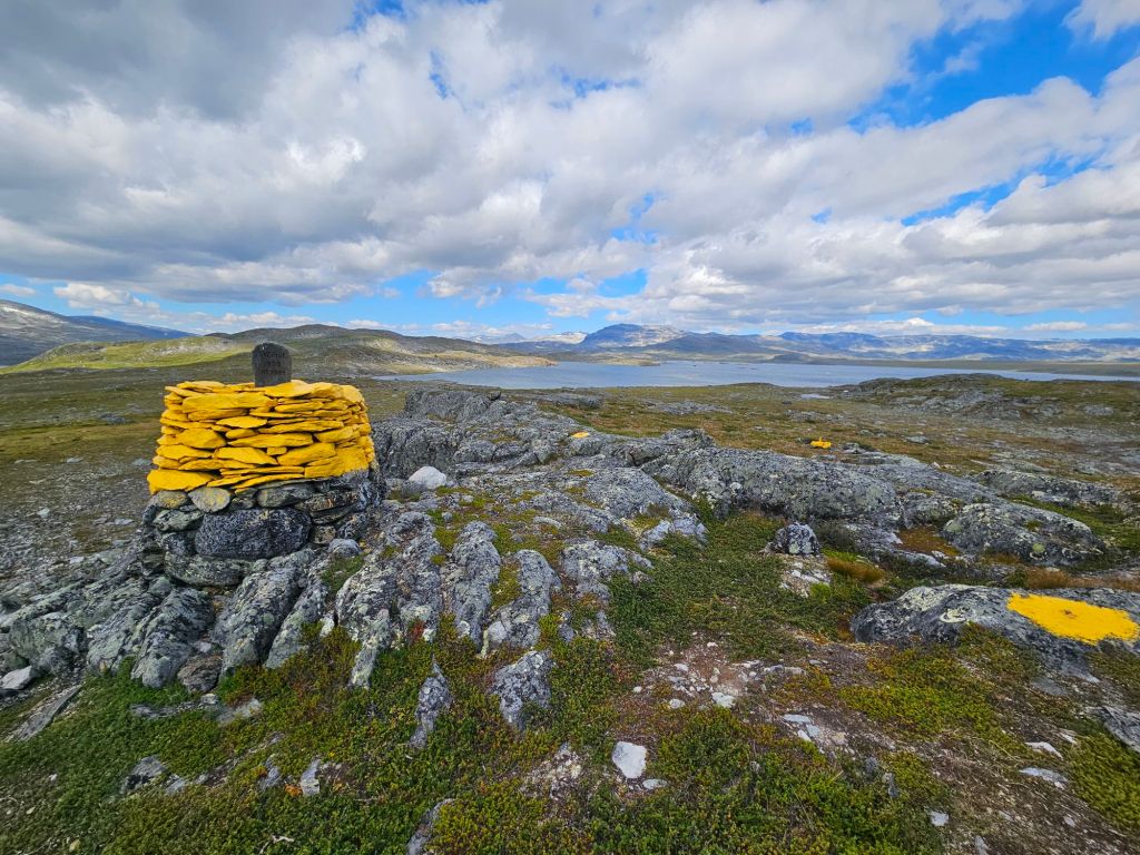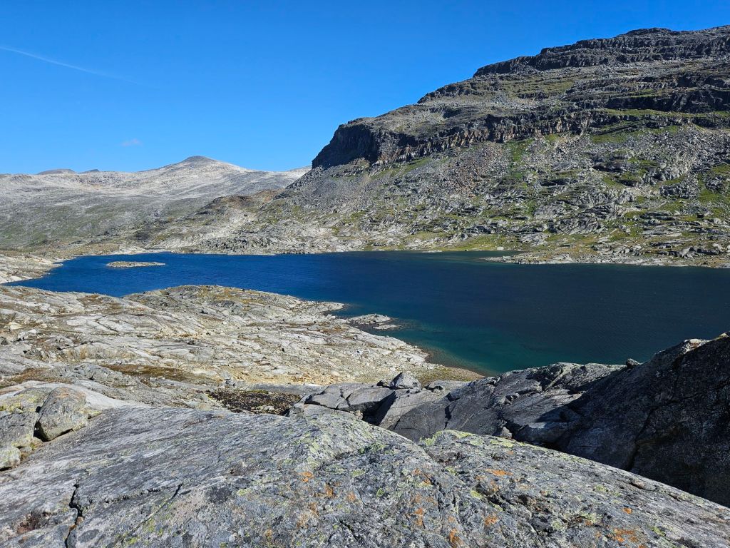 Normalerweise geht der Weg nun runter zum Gautelisvatnet und zur DNT Hütte Gautelis. Doch ich bleibe gerade auf der Höhe und ziehe weglos unterhalb des Trehakfjellet weiter, vorbei am See Trehakvatnet. Dies erspart mir ein paar Kilometer und vor allem Höhenmeter.