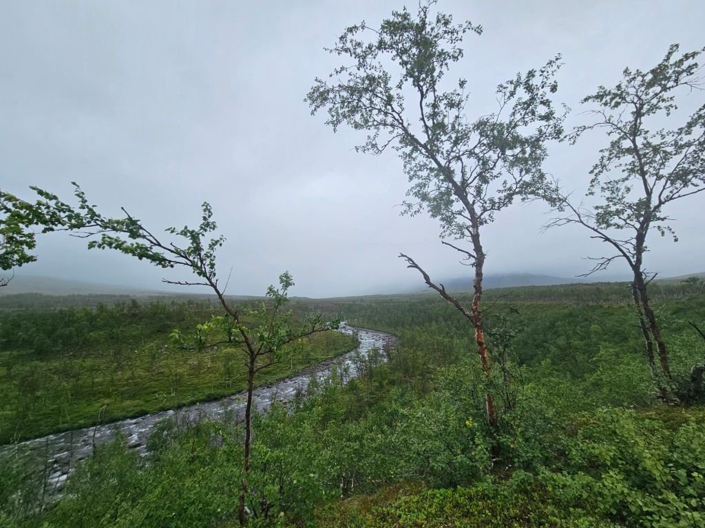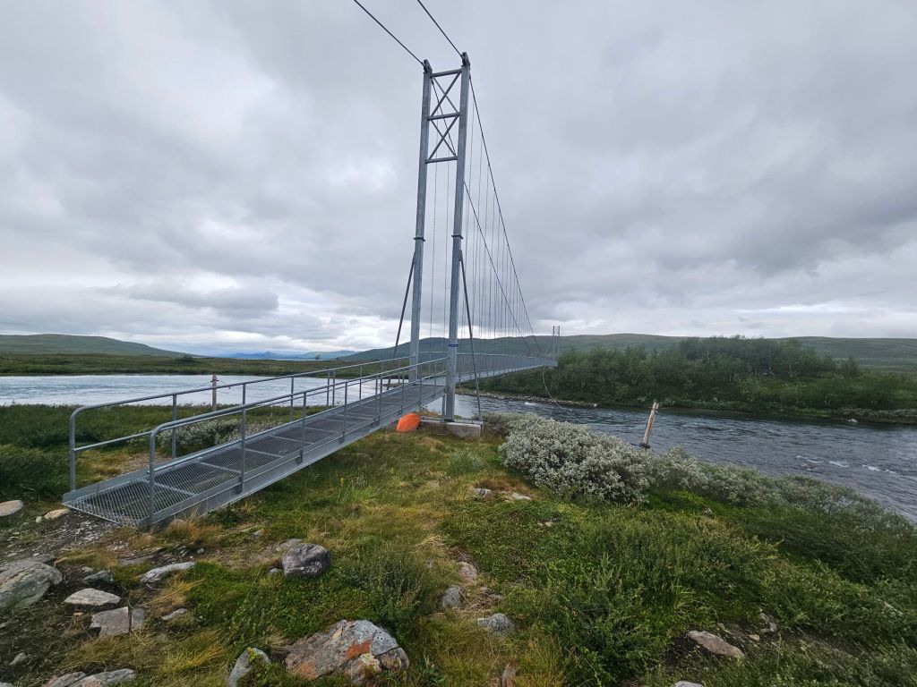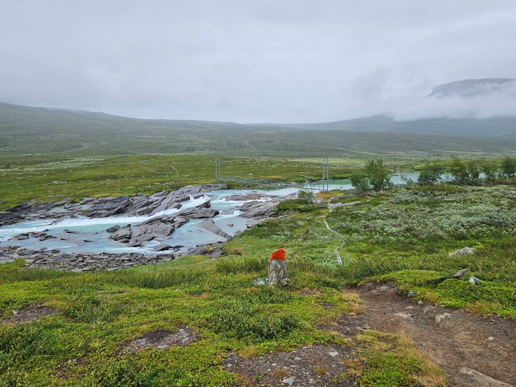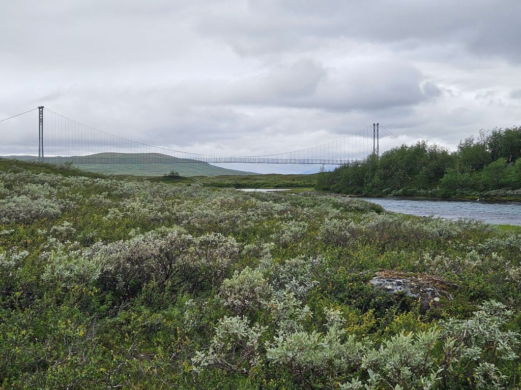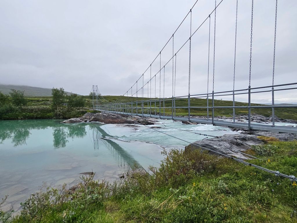 Der Weg bis zu den drei Hängebrücken bei Sáluhávrre bleibt weiterhin eine Augenweide. Einfach zu laufen, fast topfeben und geradeaus. Immer wieder blicke ich in das Fjell oberhalb Kutjaure hoch und muss feststellen, hier wäre ich permanent im Nebel und Regen über Steine und Bäche gelaufen. Glück im Unglück mit der missglückten Landung.
