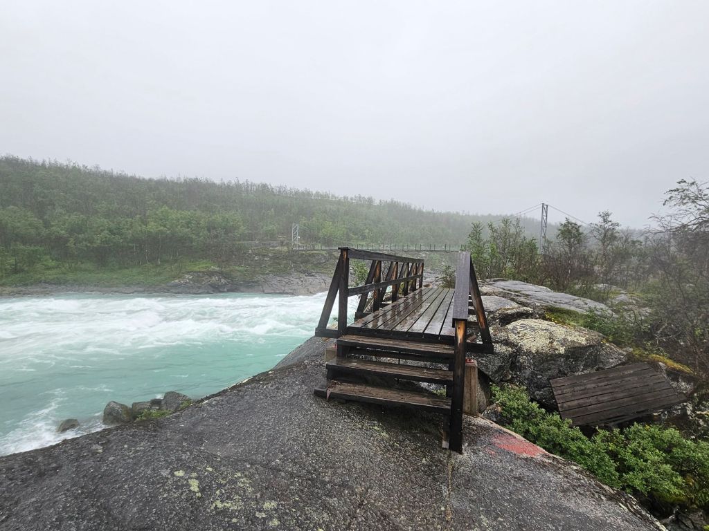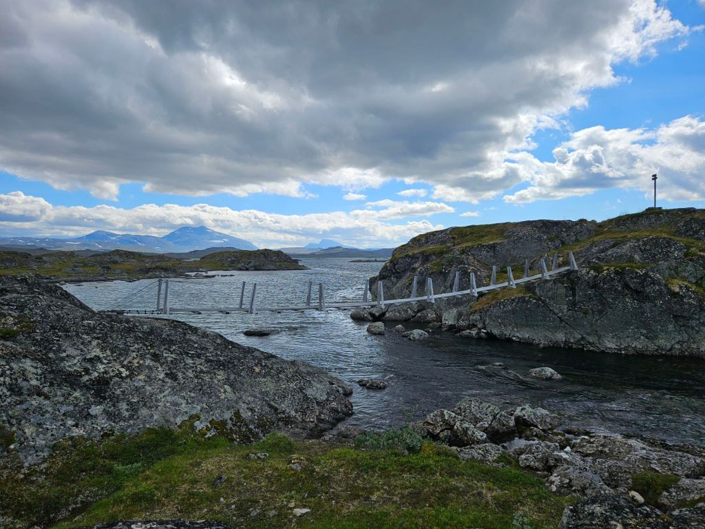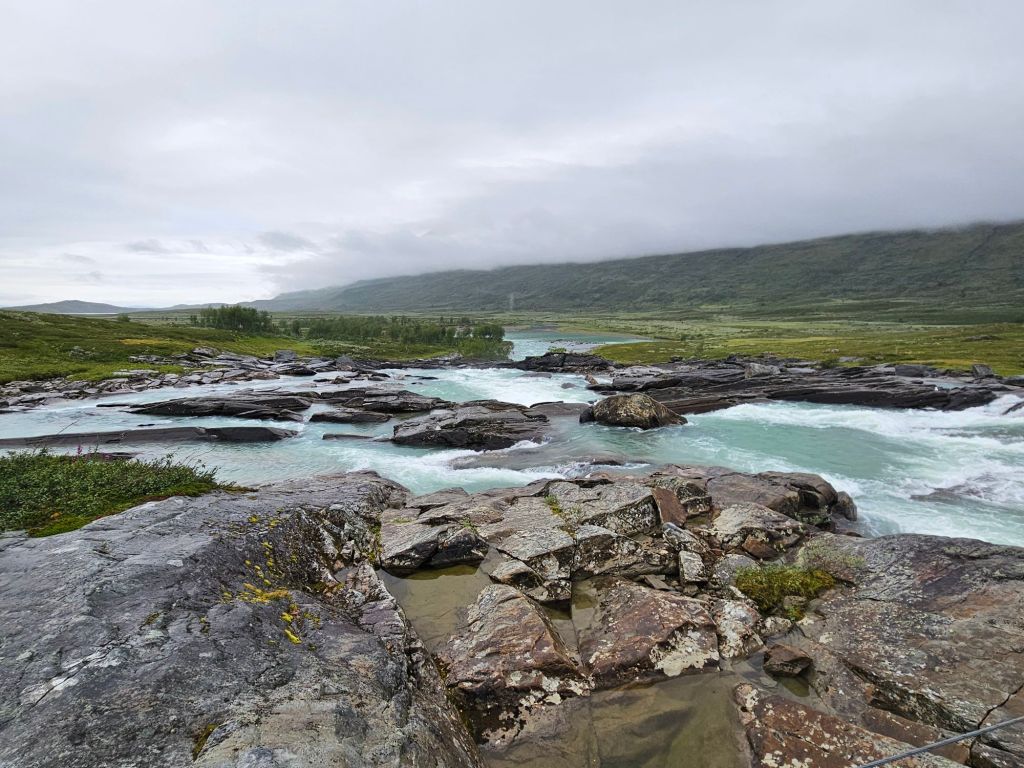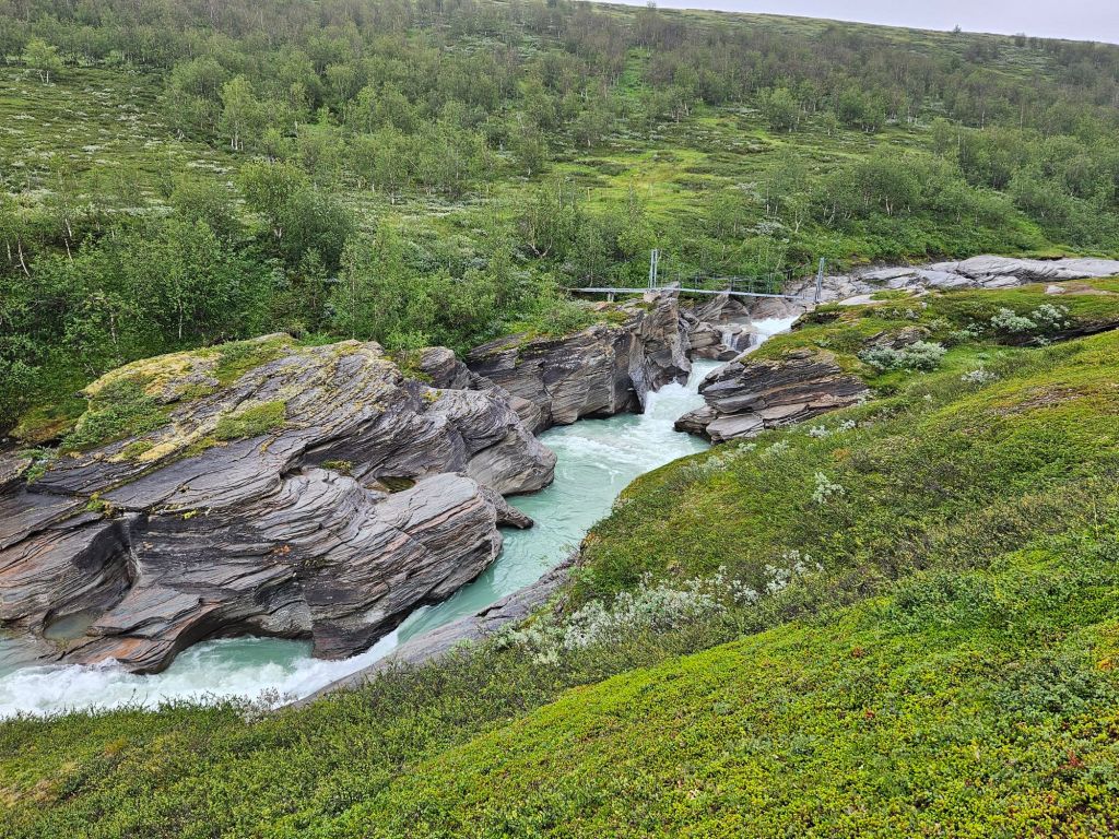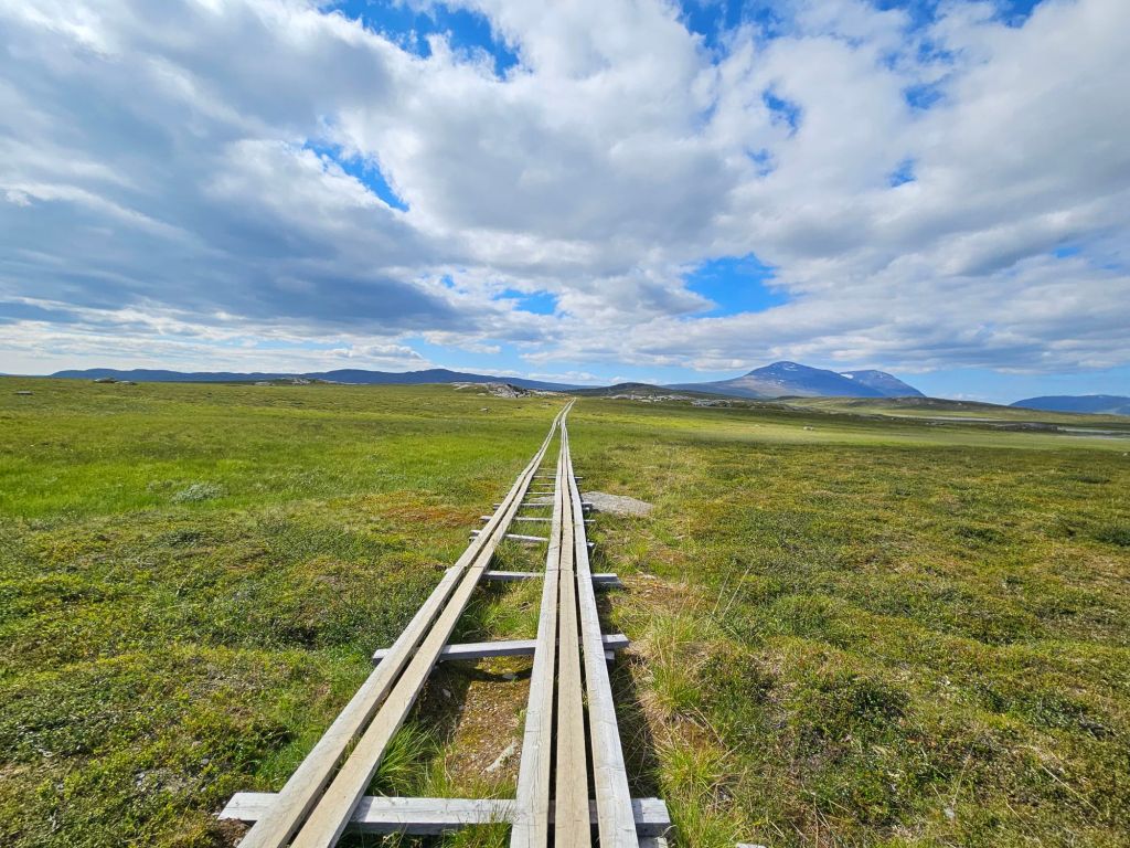Der Weg bis zu den drei Hängebrücken bei Sáluhávrre bleibt weiterhin eine Augenweide. Einfach zu laufen, fast topfeben und geradeaus. Immer wieder blicke ich in das Fjell oberhalb Kutjaure hoch und muss feststellen, hier wäre ich permanent im Nebel und Regen über Steine und Bäche gelaufen. Glück im Unglück mit der missglückten Landung.
