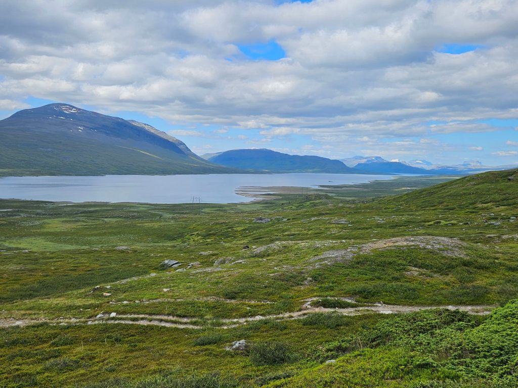 Der Weg von Hukejaure nach Sitasjaure geht fast immer abwärts. Vorbei an der grossen Sami Siedlung in Ainnaskáidi, begleitet mich unentwegt eine fantastische Landschaft mit unvorstellbaren Weiten. Es ist heiss und drückend, aber auch heute weht ein leichter Wind, was es einiges angenehmer macht.