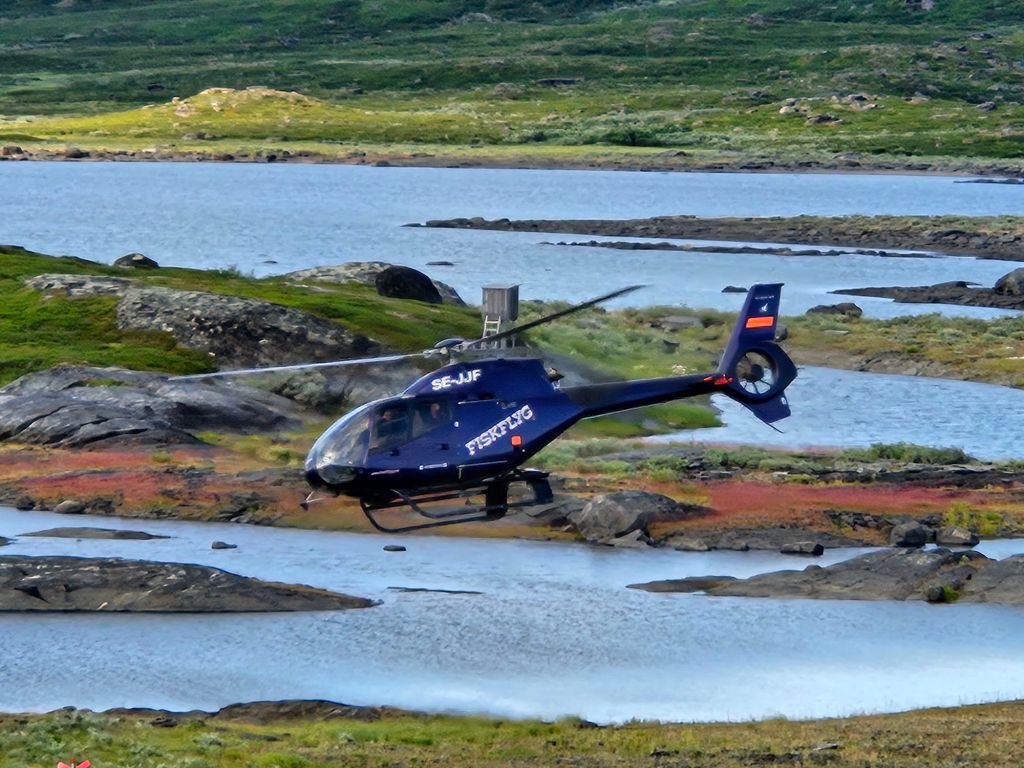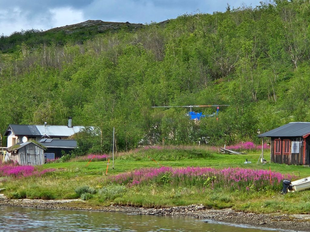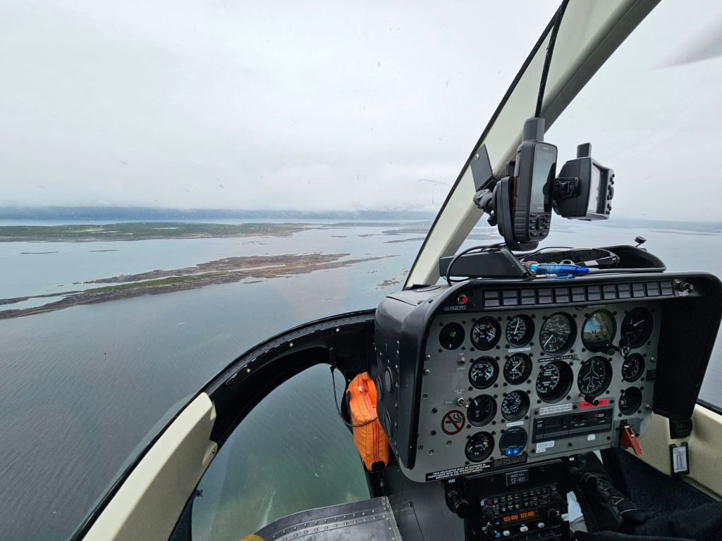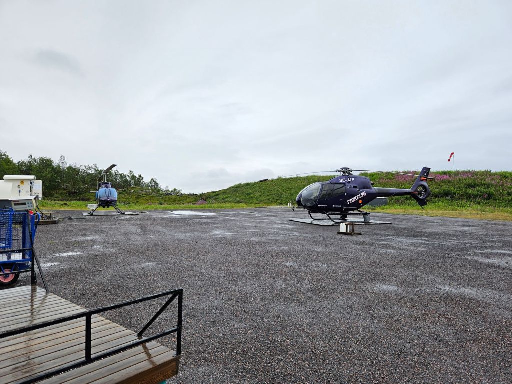 Der Flug ist planmässig, aber ich der einzige Passagier. Den Piloten Mikkel kenne ich schon länger über Instagram und es freut mich, dass er gerade heute Dienst hat und mich über den See bringt. Dafür wird der Heli im Rückflug voll sein. Mit Mikkel spreche ich ab, dass, falls eine Landung im Fjell wegen des Nebels nicht möglich ist, er mich zur Samihütte Akkastugorna bringen kann, wo er auch Leute abholen muss.