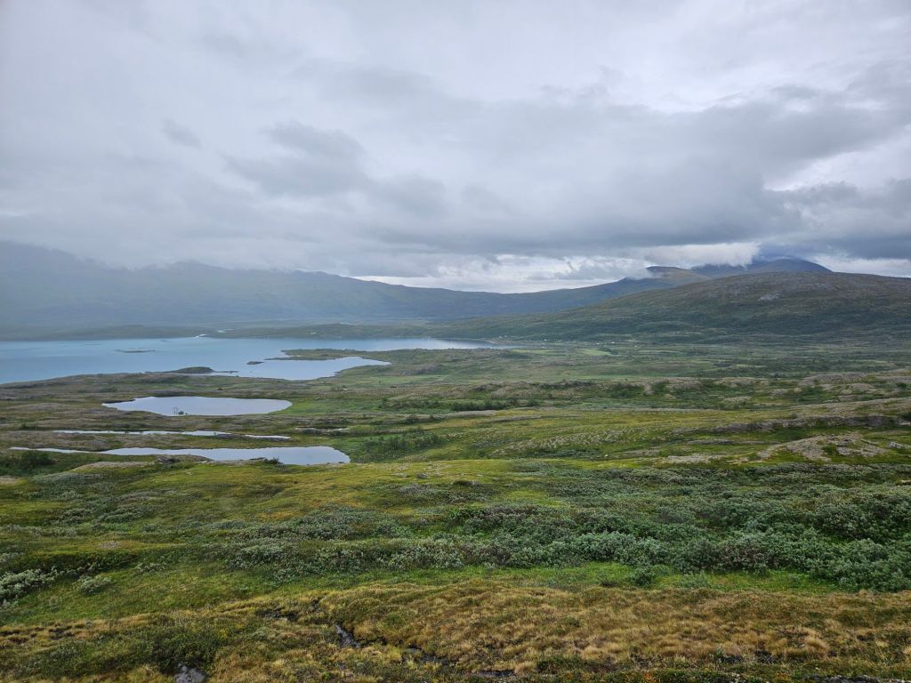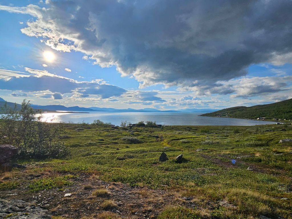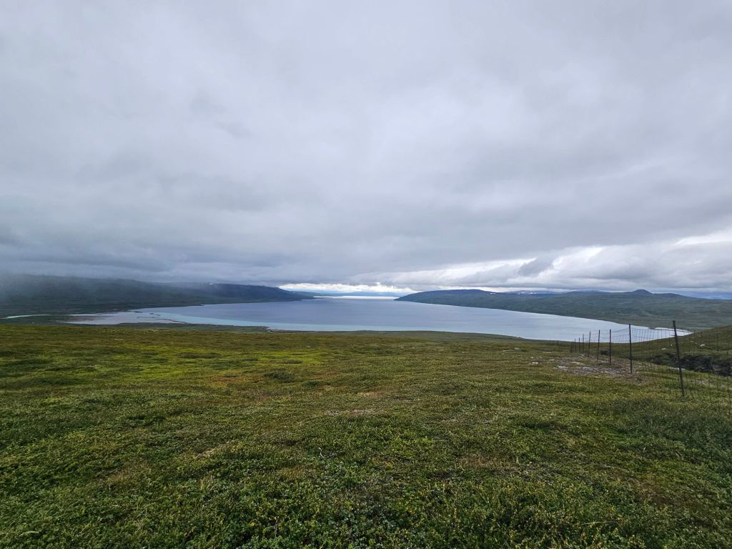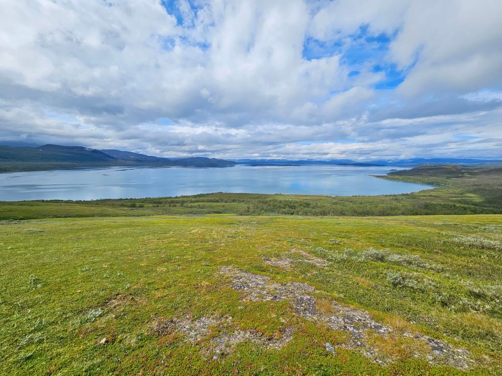 Mit gefülltem Bauch geht es den zweiten Hügel hoch und schon bald öffnet sich wieder ein gewaltig schönes Panorama. Der Virihaure ist der 5. grösste Binnensee Schwedens und besticht mit einer wunderschönen Farbe… wenn die Sonne reinscheint.