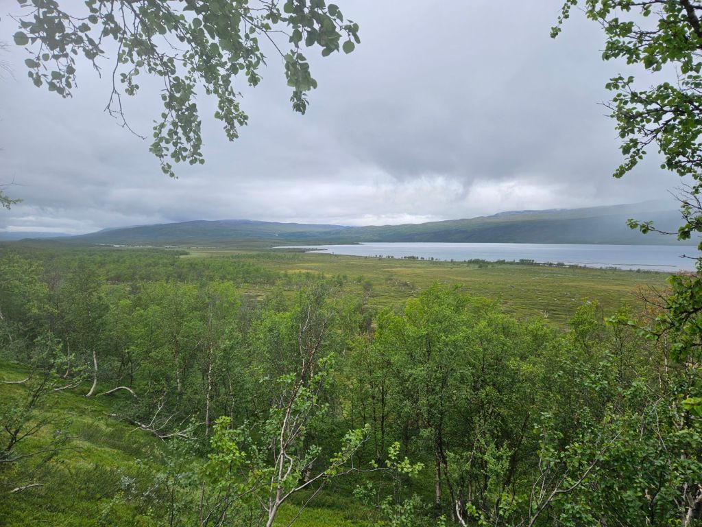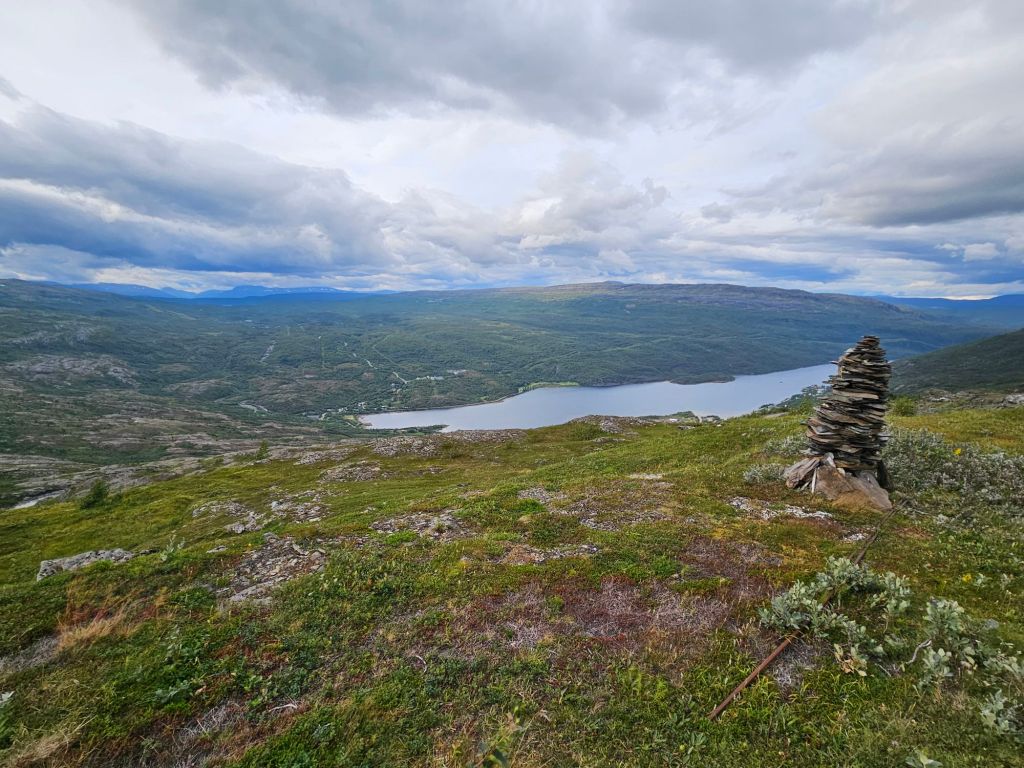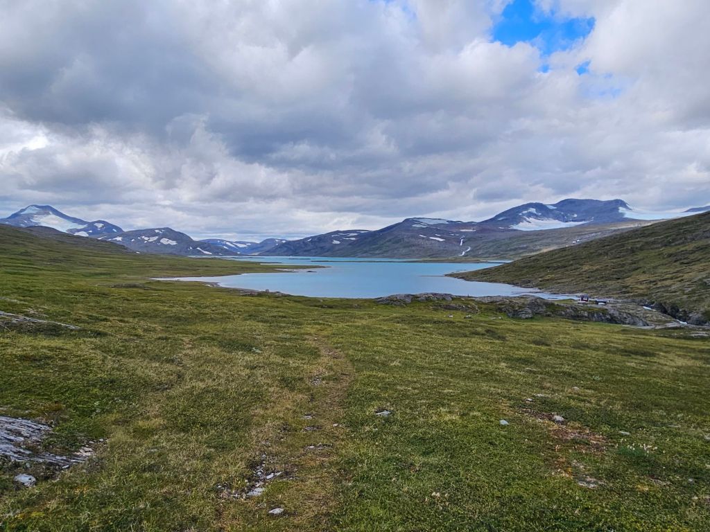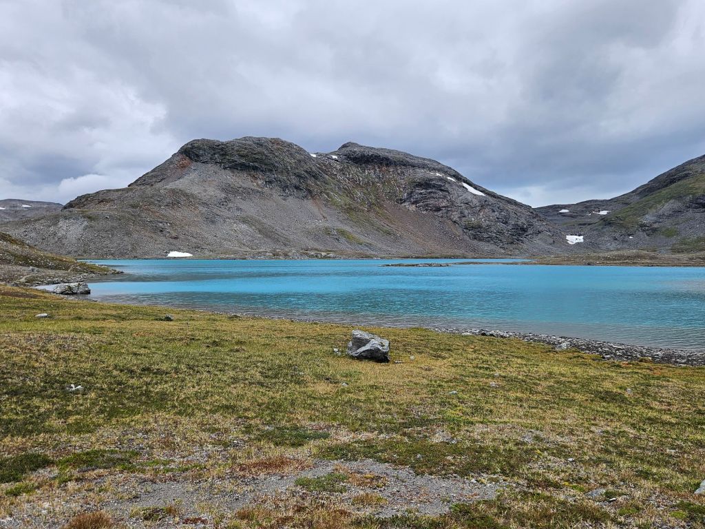 Mit gefülltem Bauch geht es den zweiten Hügel hoch und schon bald öffnet sich wieder ein gewaltig schönes Panorama. Der Virihaure ist der 5. grösste Binnensee Schwedens und besticht mit einer wunderschönen Farbe… wenn die Sonne reinscheint.