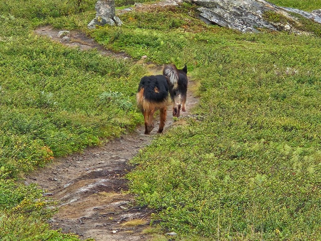 Als ich eine halbe Stunde unterwegs im Aufstieg bin, kommt mir ein Schwede mit zwei Hunden entgegen. Wir reden kurz miteinander und die beiden Vierbeiner sitzen hechelnd daneben. „Ähh…das sind nicht meine, die laufen mir seit zwei Stunden nach und ich weiss nicht wem die gehören“ sagt der Schwede. Kaum läuft er los, hat er die beiden wieder im Schlepptau. Nun, es müssen Sami Hunde sein, denn andere Hunde sind im Sommer nicht erlaubt im Padjelanta.