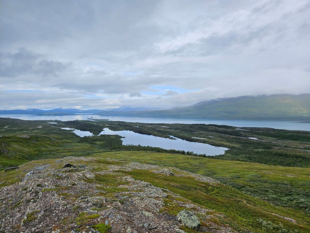 Am Horizont sehe ich die norwegischen Berge von Rago. Auf der anderen Seite der grossen Seen, war ursprünglich eine Alternativroute von mir geplant gewesen, doch die unsicheren Wetterprognosen, haben mich schon in Narvik umplanen lassen.