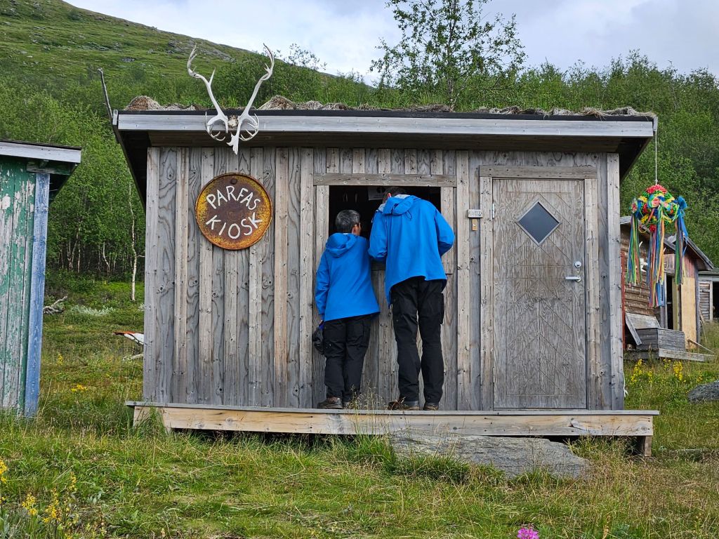 Als ich bei den Samihütten in Árasluokta ankomme, sehe ich von weitem dass der Kiosk offensteht. Ich freu mich schon, die nette, kleine, alte Samifrau wiederzusehen, die diesen Kiosk betreut. Ich kenne sie schon seit Jahren und habe mich immer herzlich mit ihr unterhalten. Doch da ist ein Mann im Kiosk, Petr. Er ist der Sohn und er erzählt mir, dass seine Mutter leider gestorben ist letzten Winter. Das tut mir sehr leid und bedauere ich gerade ziemlich.