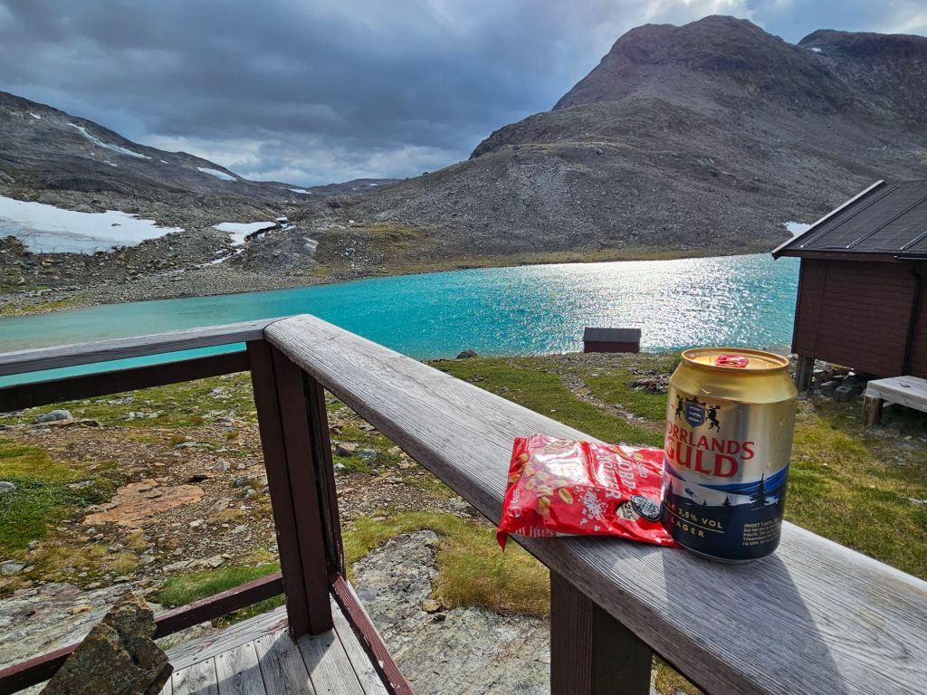 Noch ein letzter Abstieg und nach 39 Km erreiche ich die Hütten von Låddejåkkå. Total zufrieden mit dem Tag, garniert mir die Hüttenwartin noch ein Einzelzimmer, frisches Fladenbrot, getrocknetes Rentierfleisch und ein Feierabendbierchen. Ausnahmsweise hat die Hütte dieses Jahr einen gut sortierten Kiosk. Dies liegt immer im ermessen der Hüttenwart/innen, zu entscheiden, ob sie das wollen oder nicht. Das ist ein Geschäft ausserhalb der Sami Gemeinde.
