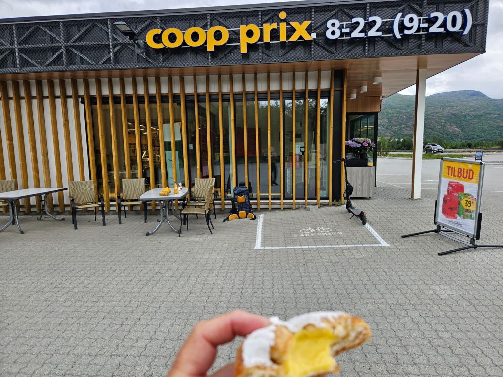 Nun bin ich rechtzeitig angekommen und es bleibt sogar noch Zeit für ein 2. Frühstück im neuen Coop von Sulitjelma.