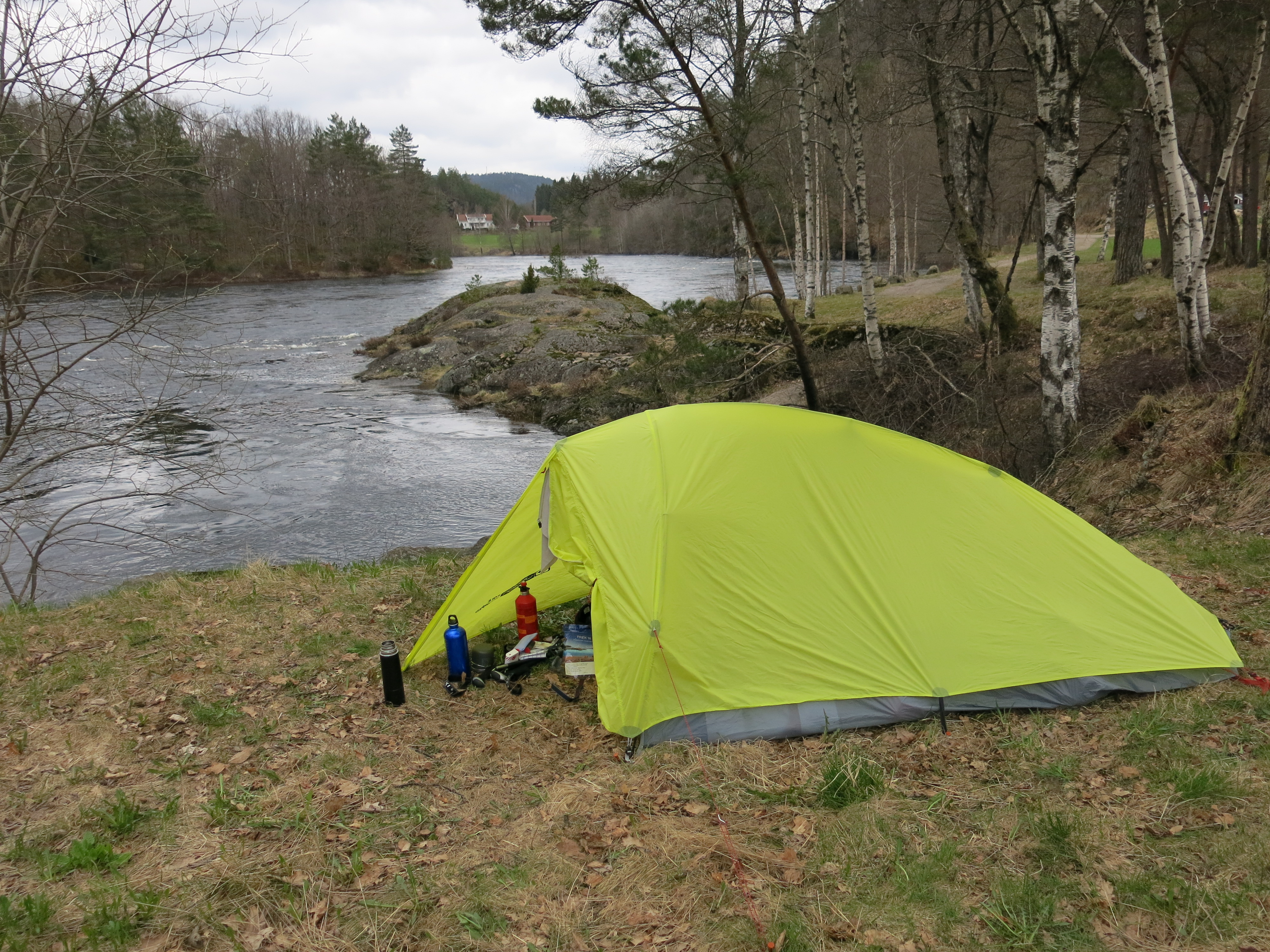 Auf der Kjellings Heia geniesse ich die Stille und das zunächst auch trockene Wetter. Hingegen kann ich mich auch nicht verwehren im linken Bein schon jetzt einen brennenden Schmerz festzustellen. Ich habe in 40 Jahren noch nie irgendwelche Probleme mit meinen Beinen oder Füssen, bin top trainiert und fit, weiss aber aus Erfahrungen von früheren Läufern dass eine Überbelastung schnell zu einer Entzündung führen kann. Aber schon jetzt, nach nur 70 Kilometern ? Es ist mir klar das sich das Problem schnell einstellen wird, wenn ich runter von den Strassen komme. Asphalt ist definitiv Gift für die Beine ! Doch der Süden lässt zu Beginn keine andere Wahl und so lasse ich es über mich ergehen und versuche den Schmerz zu ignorieren. Die Abkürzung durch den Wald nach Øvre Laudal lasse ich aber bleiben, da die Bodenverhältnisse sehr nach Sumpf aussehen, und ich hier auf 300 Höhenmetern auch auf erste Schneeresten treffe. In Stokkeland nehme ich nun eine Nebenstrasse, welche hinunter ins Marnardal führt, an den Lachsreichsten Fluss in Südnorwegen dem Mandalselva. Auf dem noch geschlossenen Camping in Fuglestveit campiere ich das erste Mal im Zelt und kann auch gleich dessen Standhaftigkeit testen, als ein Sturm am Morgen früh darüber hinwegfegt.