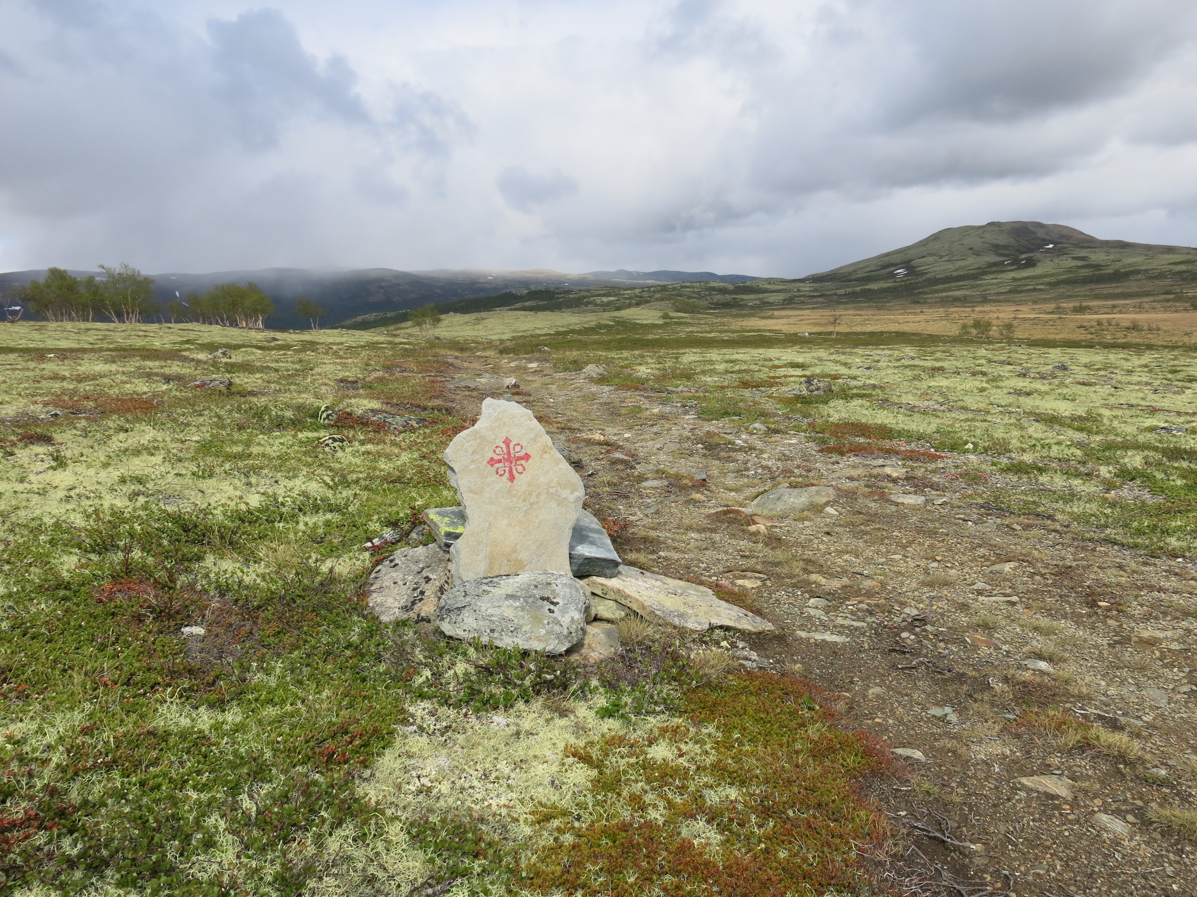 Ich habe natürlich nicht nur Pech auf meinem Trip gen Norden. Denn, das Dovrefjell lässt mich etwas vor langen Spaziergängen entlang der Strasse fürchten. Doch hier kommt mir auch mal das Glück etwas entgegen. Von Dombås aus zieht ein alter Weg ins Fjell hoch und auf halbem Weg zur Fokstugu, ist ein brandneuer Schotterweg bis zur Fokstugu Hütte errichtet worden. Ich muss also nicht viele Kilometer der E 6 entlang laufen, sondern kann mich gemütlich auf dem neuen Weg „breitmachen“ und das phantastische Fjell geniessen. Der Weg ist übrigens kein geringerer als der bekannte Olavsvegen von Hamar nach Trondheim. Die Kaltfront hat mittlerweile die Temperaturen wieder gegen die 5 ° C sinken lassen, aber die Luft ist wunderbar klar und frisch. Das Wetter ist richtig wild und wechselt zwischen Sonnenschein und Schneegraupel hin und her, einfach tolles Wanderwetter.