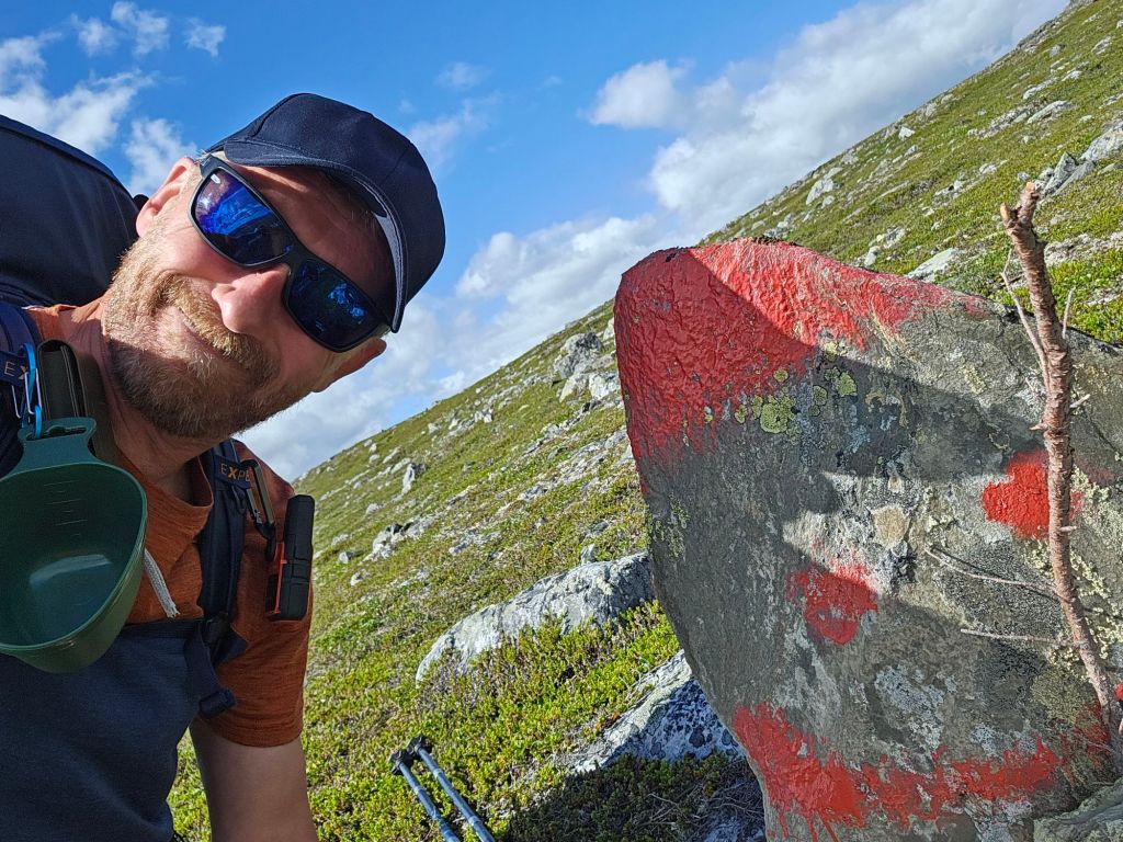 Als die Strasse endet, staune ich nicht schlecht, als ich auf dem ATV Track einen Stein mit einem roten T erkenne. Das Wanderwegzeichen des norwegischen Wanderverbands DNT.