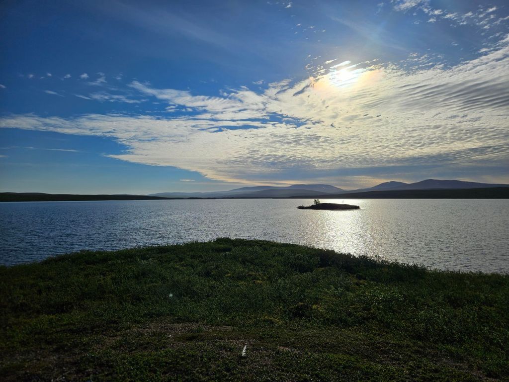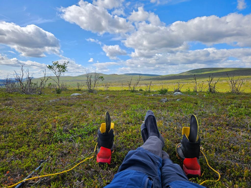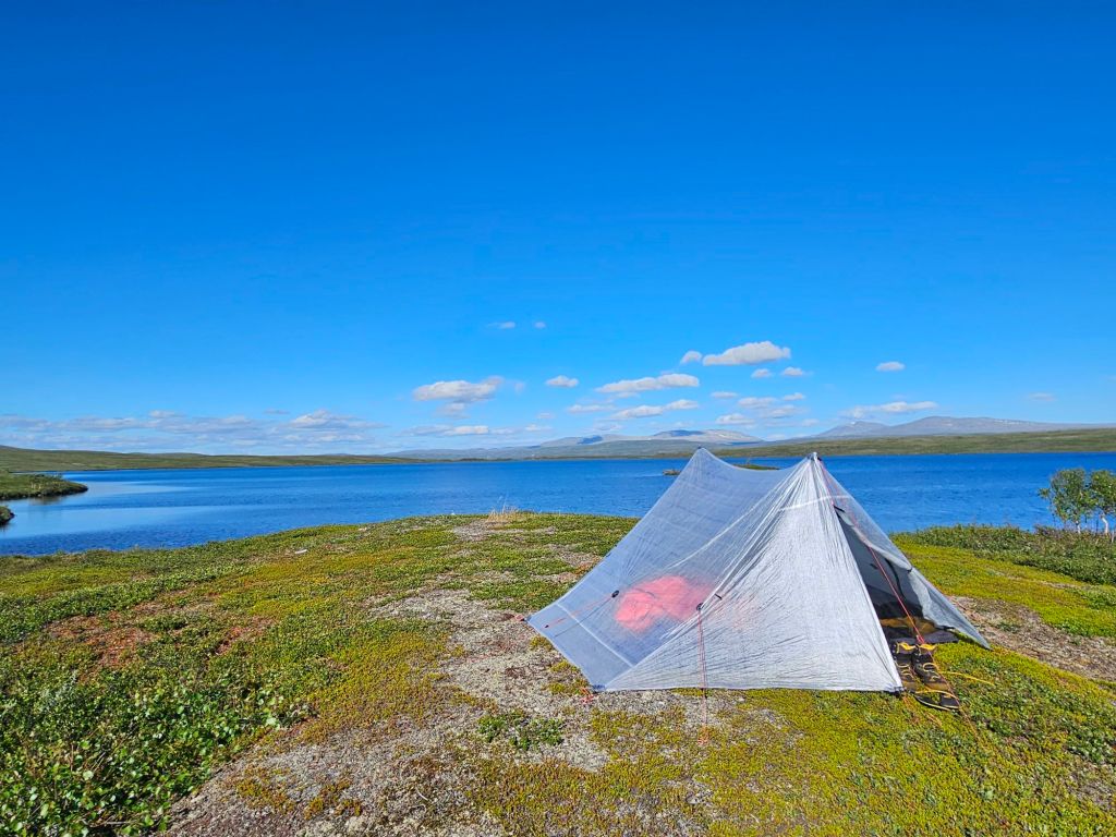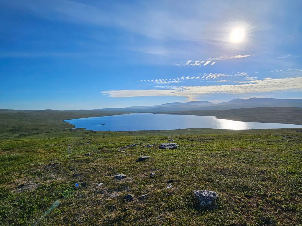 Obwohl es hier auf dem Hügel noch eine leichte Brise hat und nicht ganz so schlimm ist, sehne ich mich nach Wasser. Vor mir liegt schon der See Rhukkojávri. Er ist mein in der Planung auserkorenes Navigationsziel für heute und mit knapp 30 Kilometer ist mein Wandertag wieder perfekt. Mit dem Fernglas erspähe ich einen perfekten Platz am See und kämpfe mich noch etwas durch Gestrüpp dorthin. Mir ist aber auch klar, dass Wassernähe auch mehr Mücken bedeutet.
