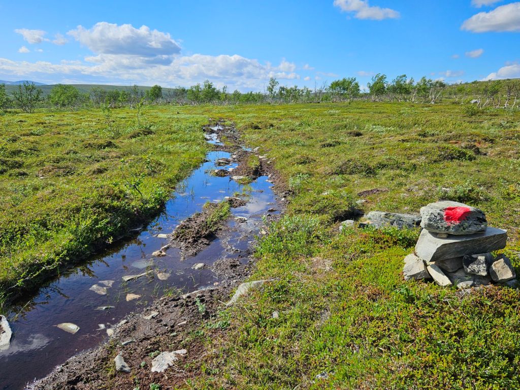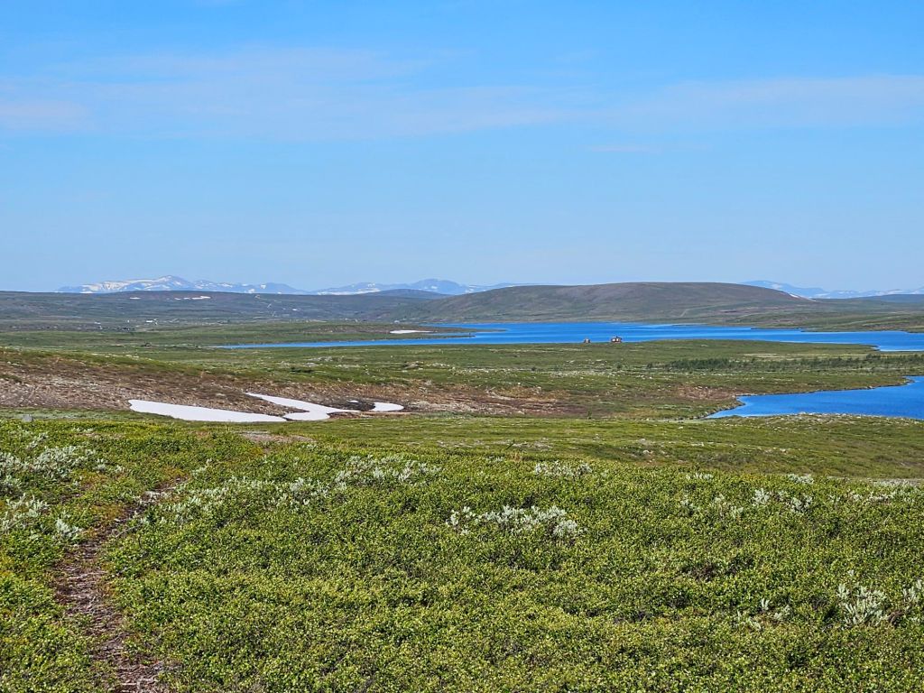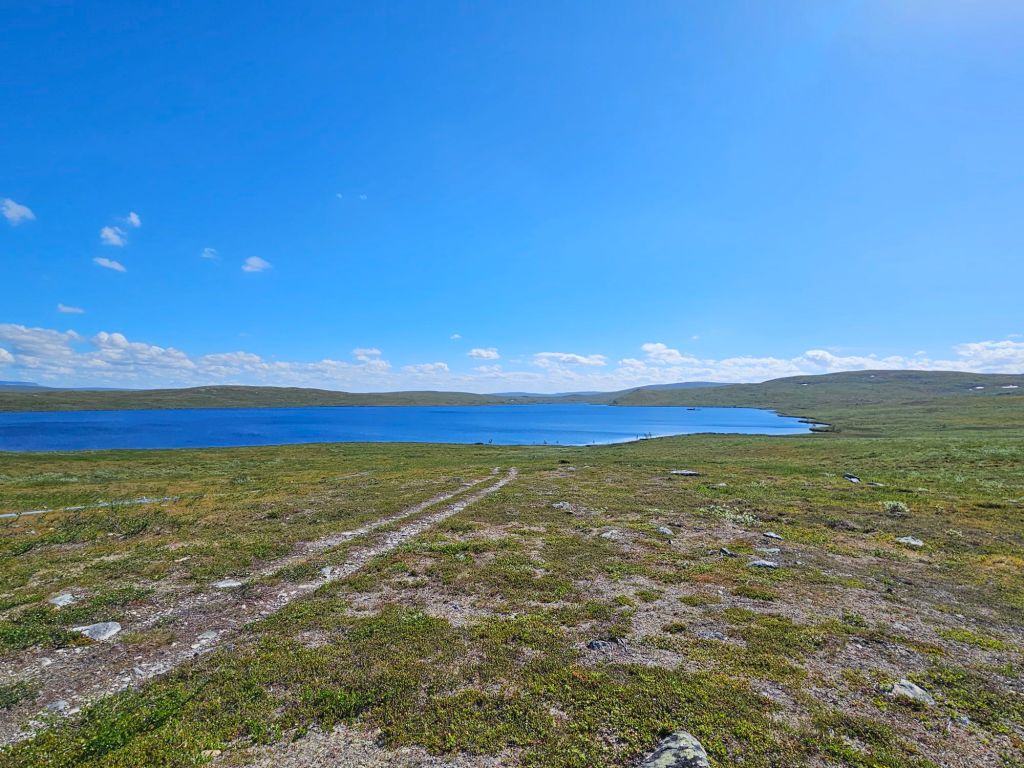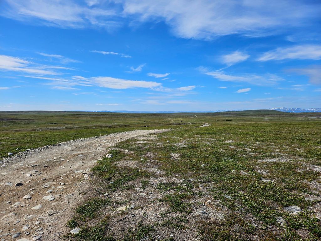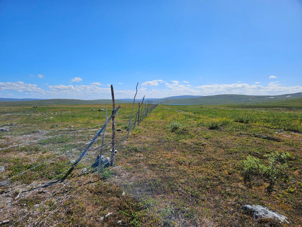 Immer wieder trifft man auf Rentierzäune oder ATV Spuren. Mittlerweile ist der Wind fast zum erliegen gekommen und es wird heiss. Schätzungsweise kratze ich an der 25° Marke und dies ohne jegliche Schattenmöglichkeiten. Irgendwie kann ich es kaum glauben. 2015 hatte ich schon so Hochsommerwetter in der Finnmark und jetzt schwitze ich schon wieder was das Zeugs hält. Der einzige Unterschied zu 2015 sind die unglaublichen Mückenschwärme. Stehenbleiben ist kaum mehr möglich und ohne Moskitonetz wird laufen zur Plage. Die Sonne und die Hitze macht die Biester so richtig aggressiv und die Windstille hilft auch nicht.