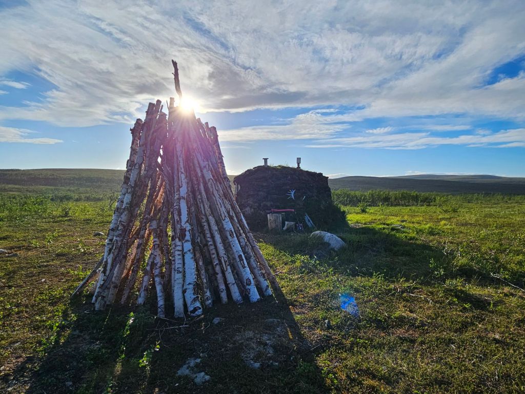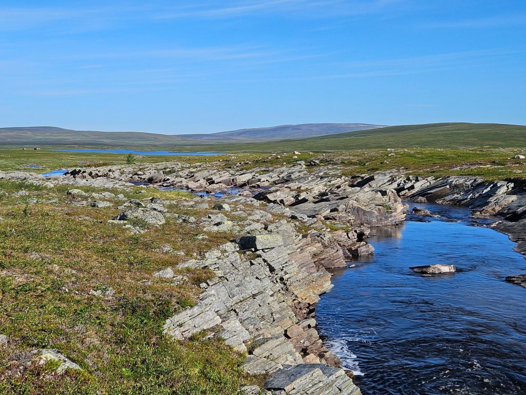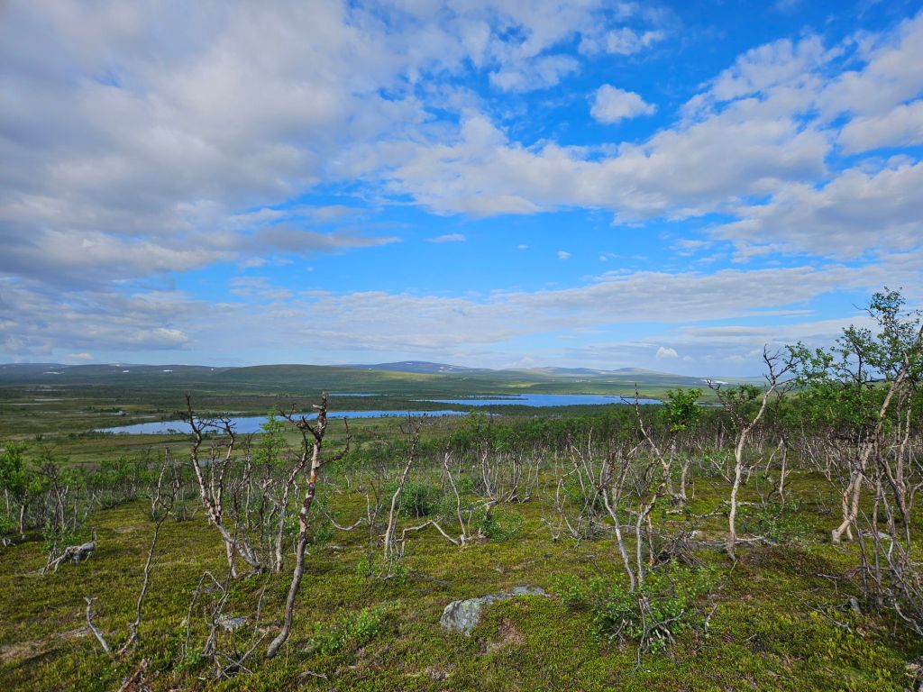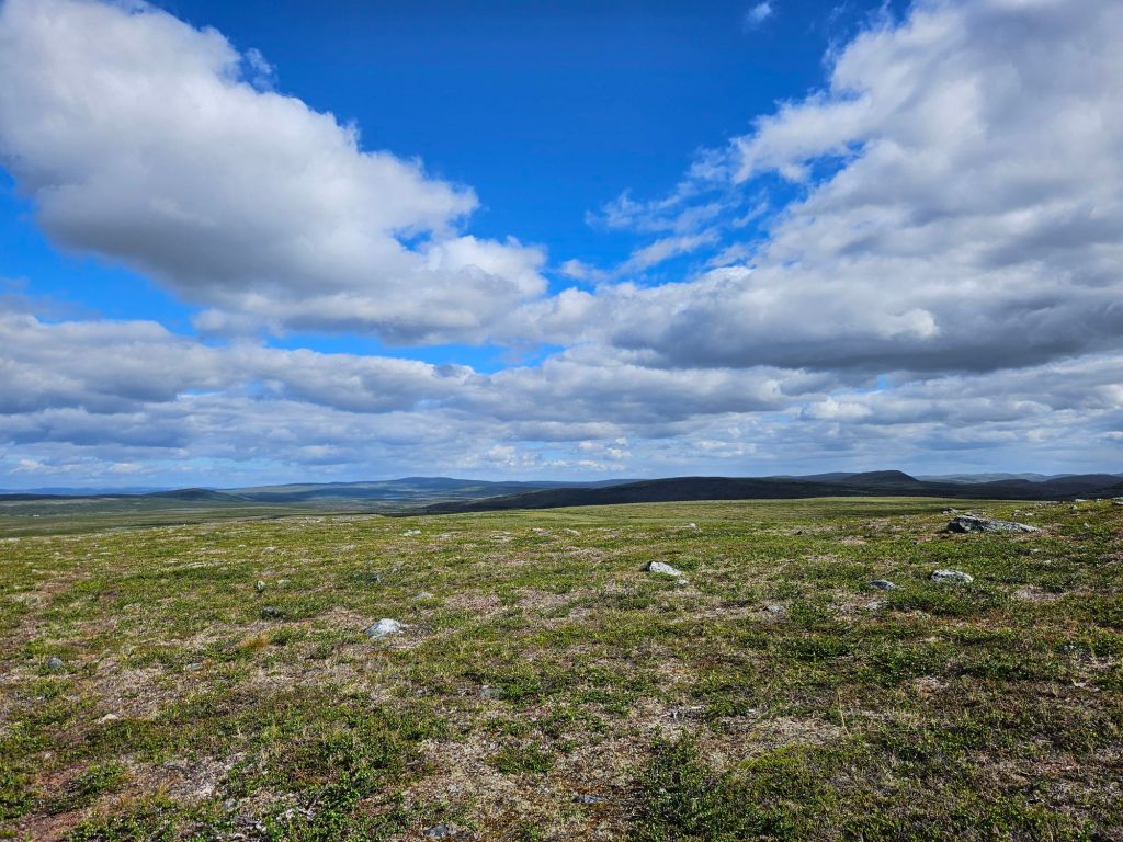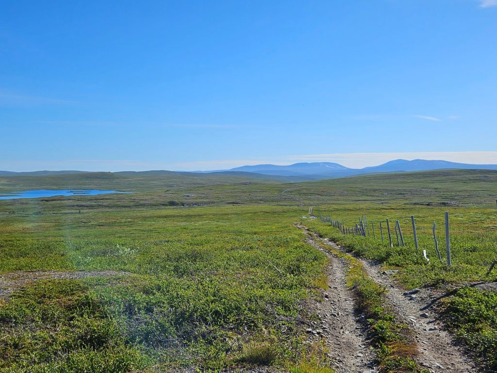 Immer wieder trifft man auf Rentierzäune oder ATV Spuren. Mittlerweile ist der Wind fast zum erliegen gekommen und es wird heiss. Schätzungsweise kratze ich an der 25° Marke und dies ohne jegliche Schattenmöglichkeiten. Irgendwie kann ich es kaum glauben. 2015 hatte ich schon so Hochsommerwetter in der Finnmark und jetzt schwitze ich schon wieder was das Zeugs hält. Der einzige Unterschied zu 2015 sind die unglaublichen Mückenschwärme. Stehenbleiben ist kaum mehr möglich und ohne Moskitonetz wird laufen zur Plage. Die Sonne und die Hitze macht die Biester so richtig aggressiv und die Windstille hilft auch nicht.