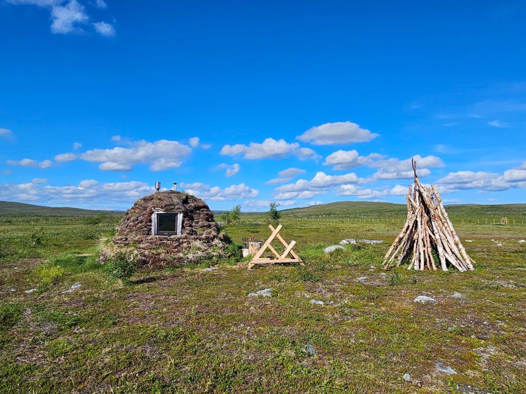 Mein Ziel nach rund 30 Km heute, ist die legendäre Bastingammen. Eine Gammen ist ein „Haus“ mit einem Holzkonstrukt, dass aussen mit Birkenrinde als Nässeschutz eingepackt wird (heute sieht man oft Baumarktpappe oder Kunststofffolie als Nässeschutz) und dann wird das ganze wie bei einem Iglu mit Torfziegel zur Dämmung eingepackt. Von aussen sieht das oft nicht so nett aus und innen ist es oft eine Überraschung, entweder positiv oder negativ!