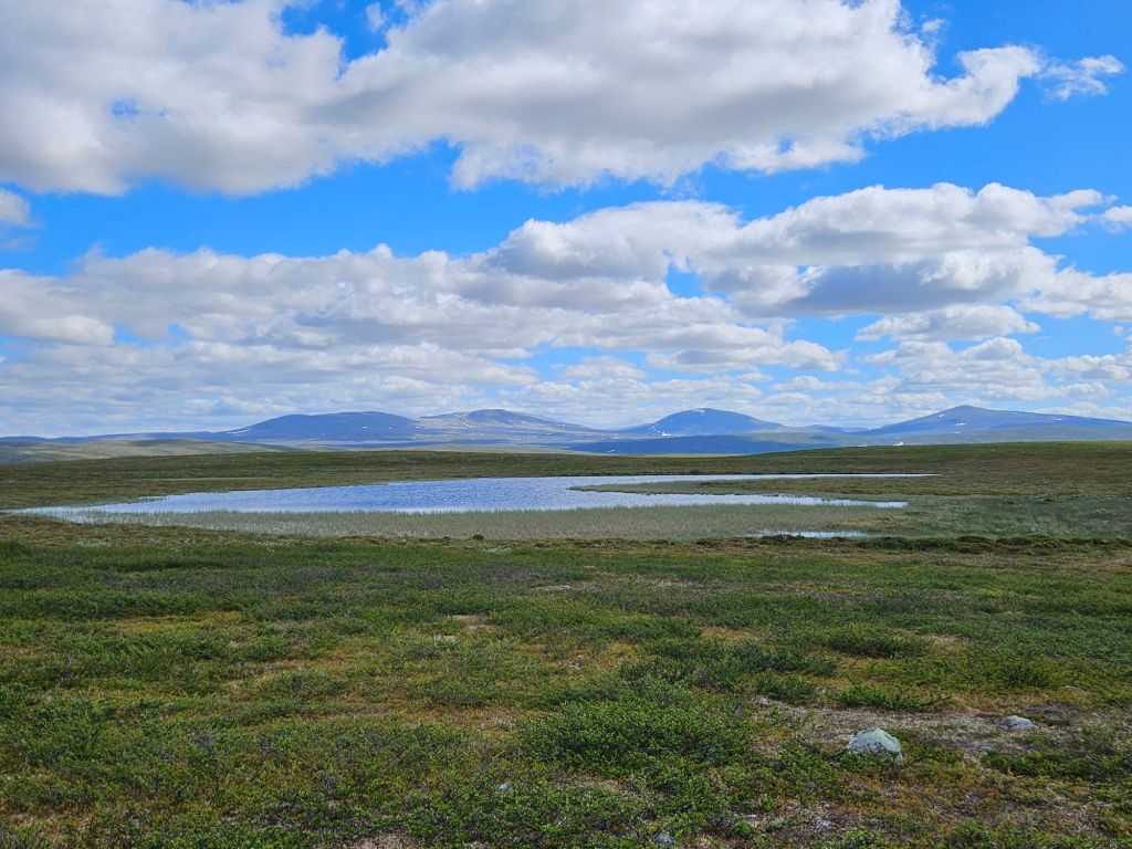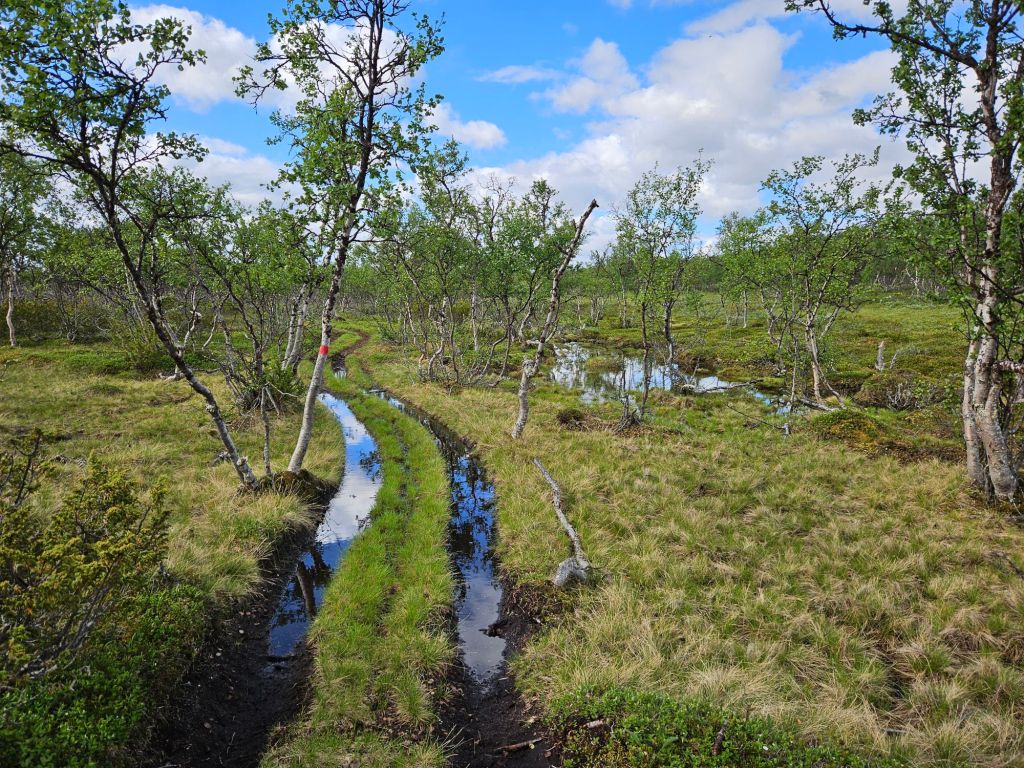 Während zwei, drei Stunden kämpfe ich mich durch den ganzen Sumpf hindurch, wobei der DNT Weg mittendurch, statt aussen rum geht. Irgendwann wird es mir zu lästig und ich versuche meinen eigenen Weg zu finden. Eine gute Lösung sind die nahen Birkenwäldchen. In ihnen ist der Boden trocken und perfekt zum laufen.