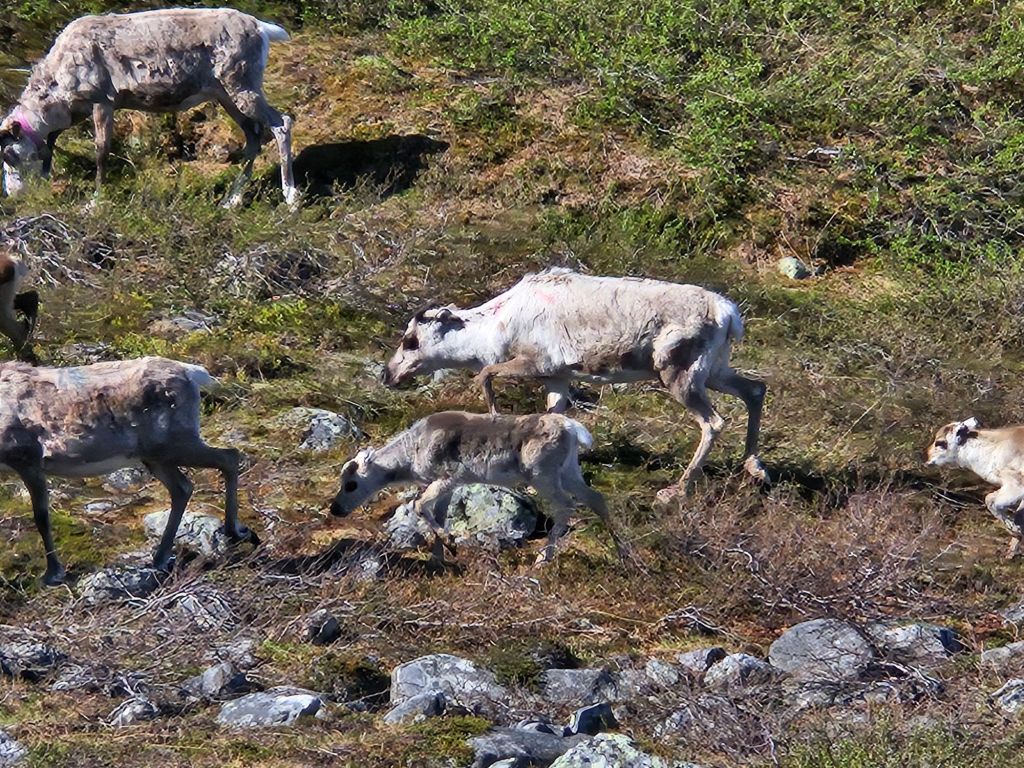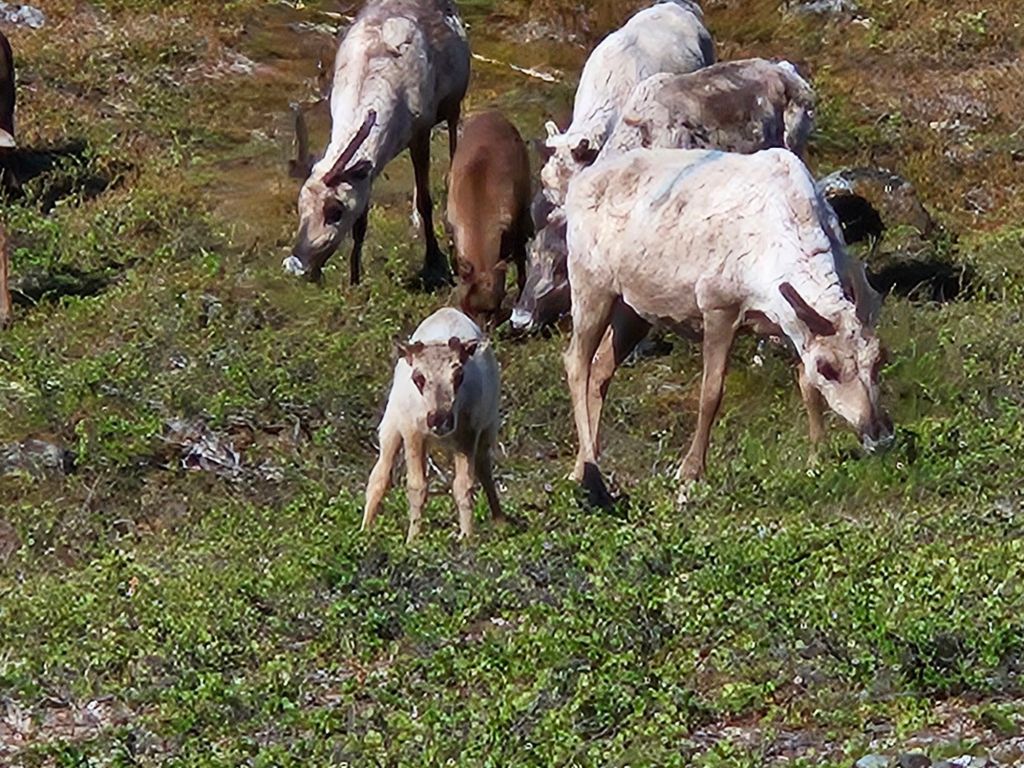 Dann plötzlich bimmelt und knarzt es auf mich zu. Eine grössere domestizierte Rentierherde läuft auf mich zu. Ihr eigenwilliges knacken mit dem Maul, erfüllt die ganze Gegend. Es hat sehr viele ganz junge Kälbchen dazwischen und es tönt wie ein überdimensionaler Rasenmäher, der sich neben mir vorbeifrisst.
