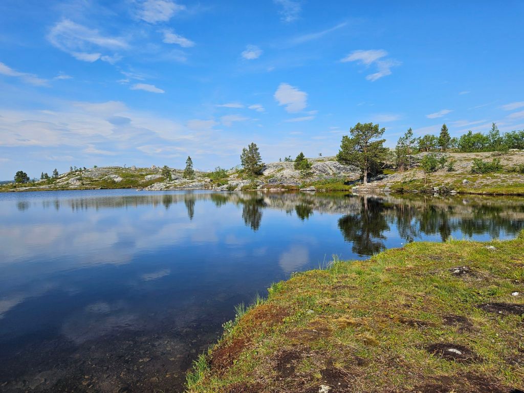 Das Zeltaufbauen und einrichten wird zum Kampf mit der norwegischen „Luftwaffe“! Aber dafür geniesse ich ein ausführliches Bad im kühlen, klaren See. Danach hingegen heisst es hinter das Moskitonetz im Zelt zu kriechen und Ruhe bewahren. So traumhaft der Platz ist, so mühsam sind die Plagegeister. Es bleibt mir nichts anderes übrig, als im Zelt zu sitzen und…schwitzen!